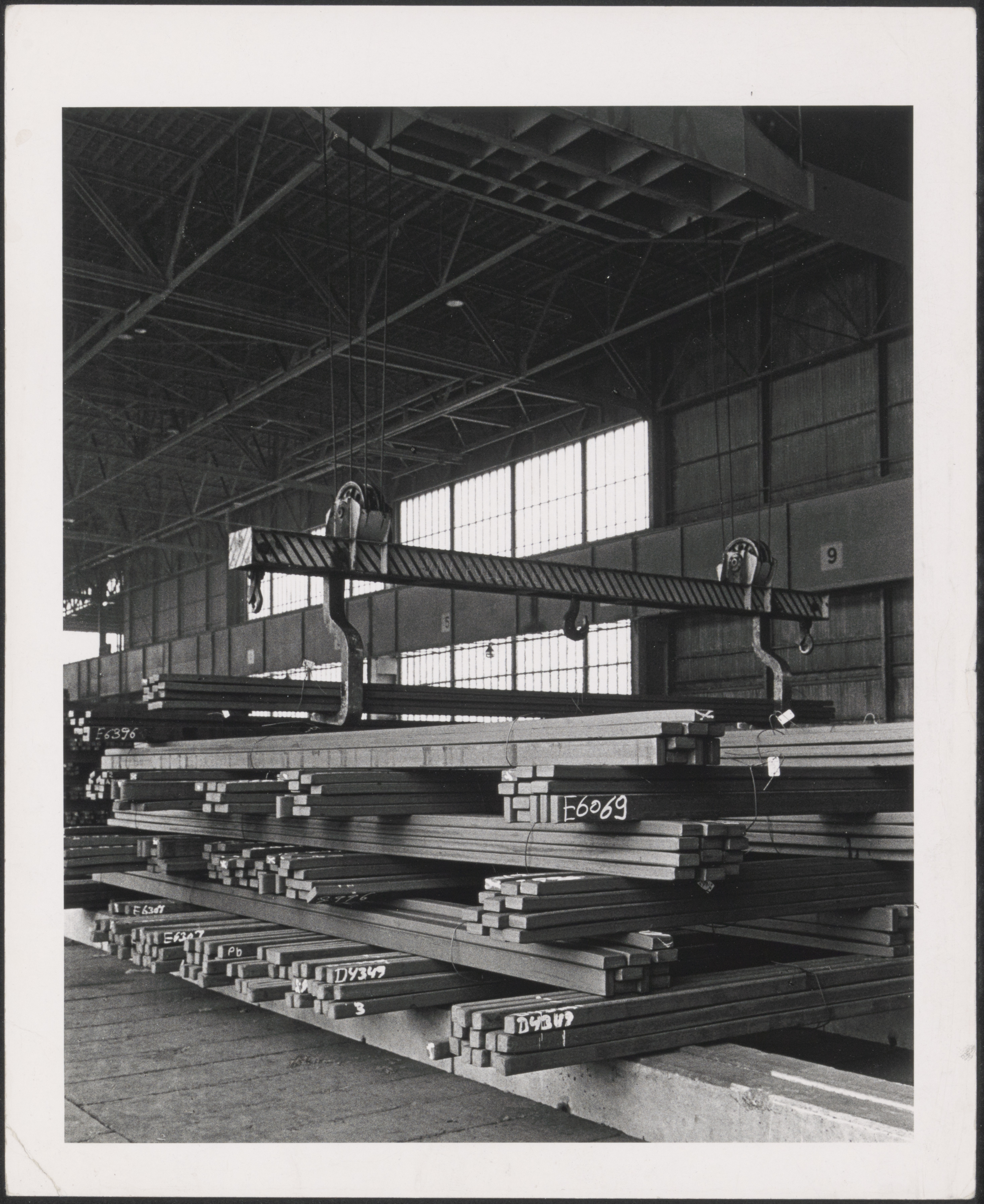 - Opslag van staven ruw metaal (knuppels) bij de kabelfabriek in Alblasserdam.