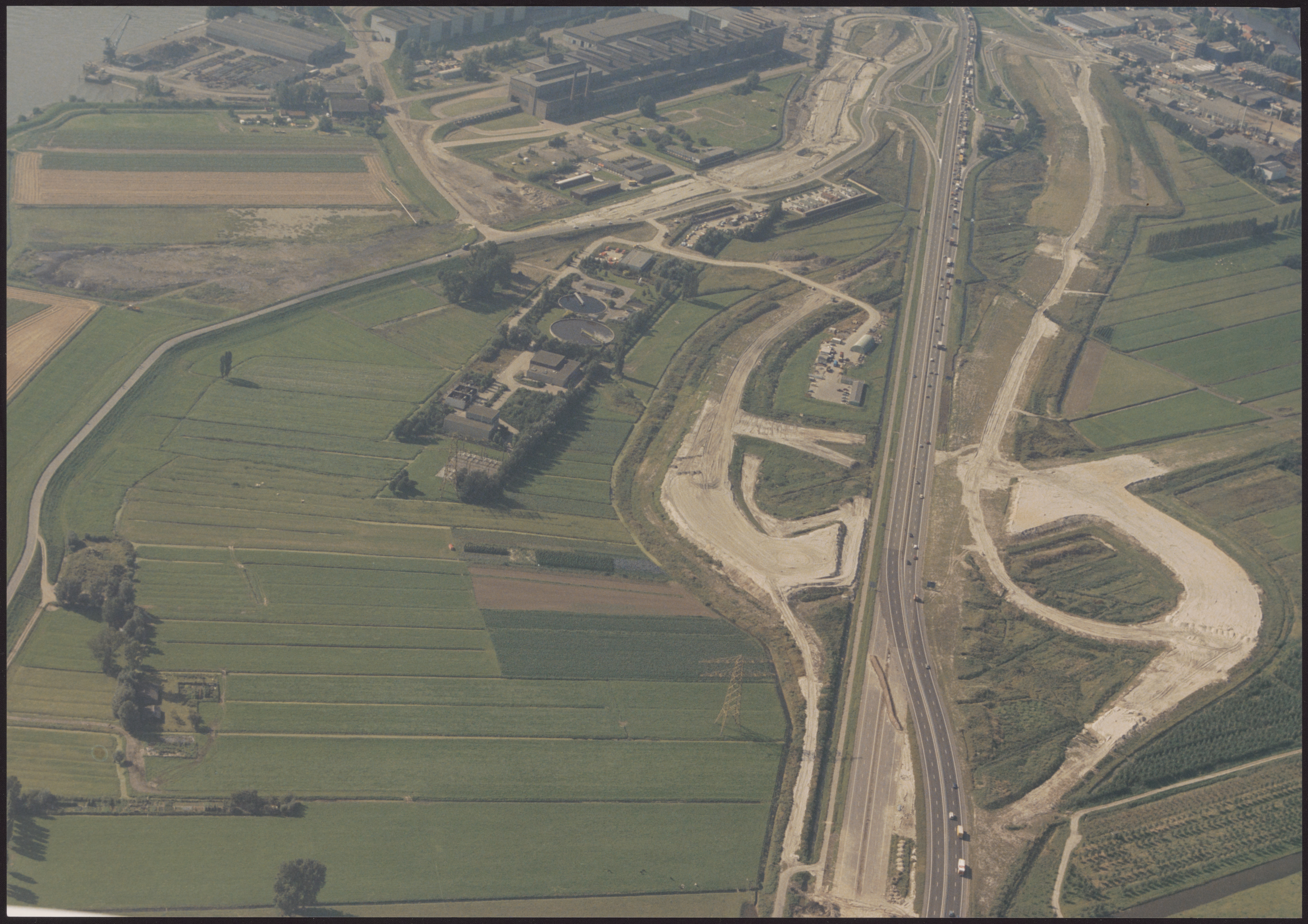 - Luchtfoto van het in ontwikkeling zijnde terrein van de kabelfabriek in Alblasserdam. In het midden de rioolwaterzuivering.