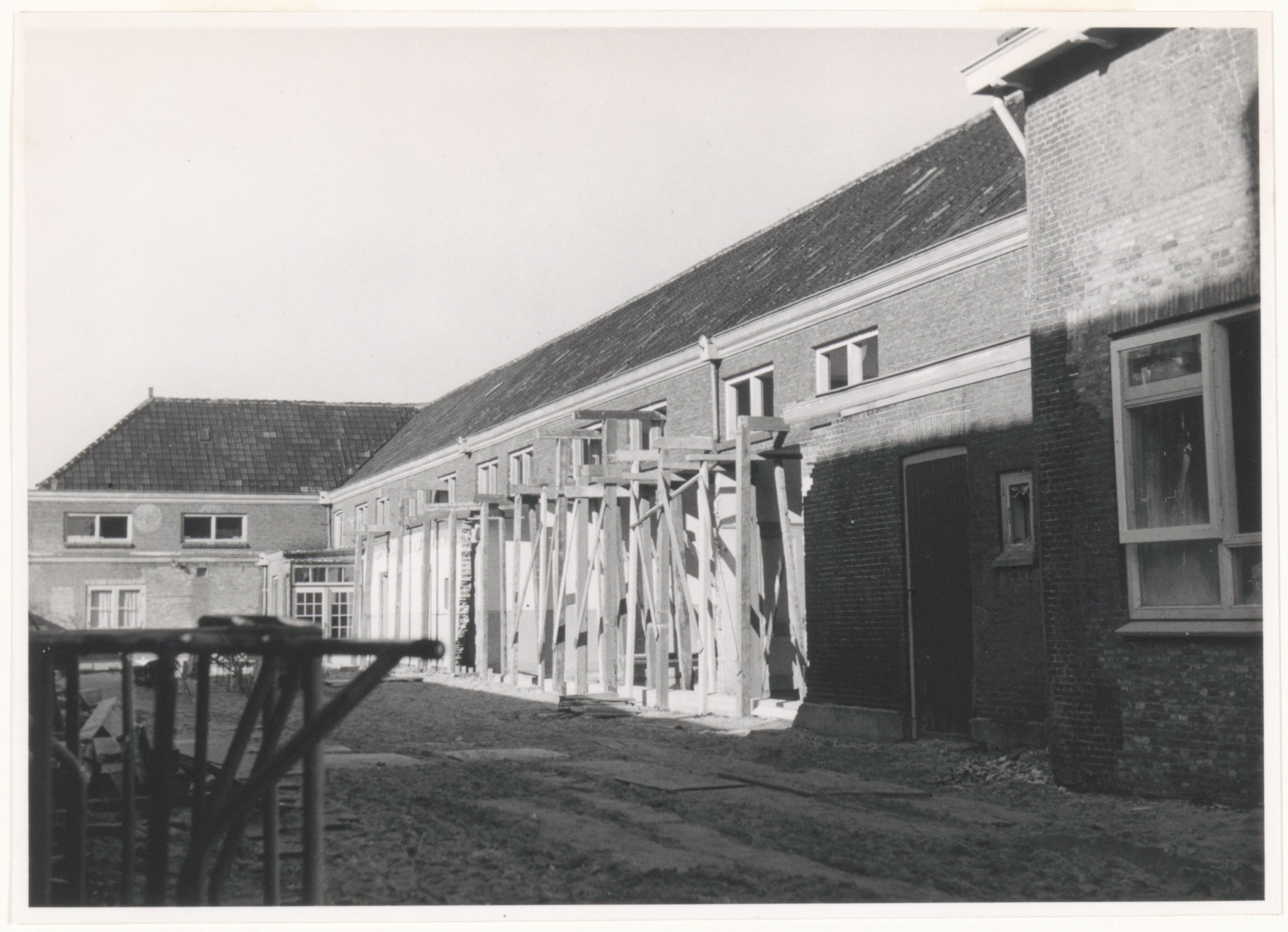 De oude openbare lagere school aan de Noord Voorstraat wordt veranderd in garages enz. voor de dienst Gemeentewerken. De openingen voor de garagedeuren in wording.
