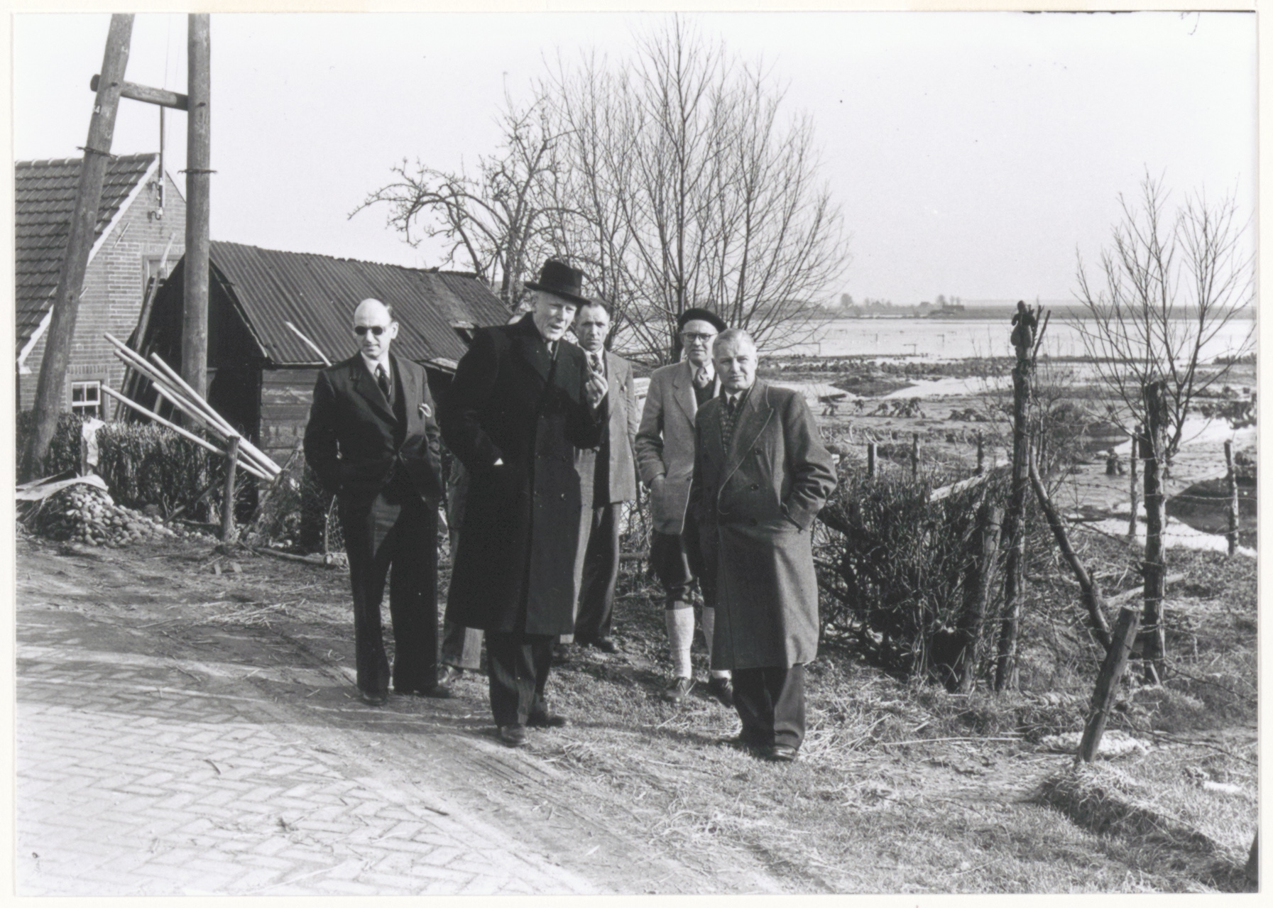- Bezoek aan Schenkeldijk en Achterdijk. Burgemeester C. van Heesen (met hoed), rechtsachter C. v.d. Linden, W.H. Verhoeff (met pet) en gedelegeerde Van Nijmegen.