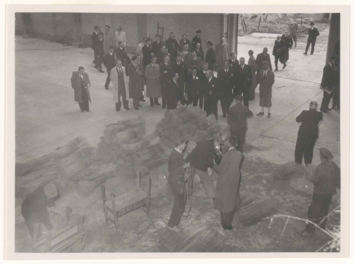 Bezoek van Z.K.H. prins Bernhard aan de vlasfabriek in 's-Gravendeel. Aanwezig o.a. G. …