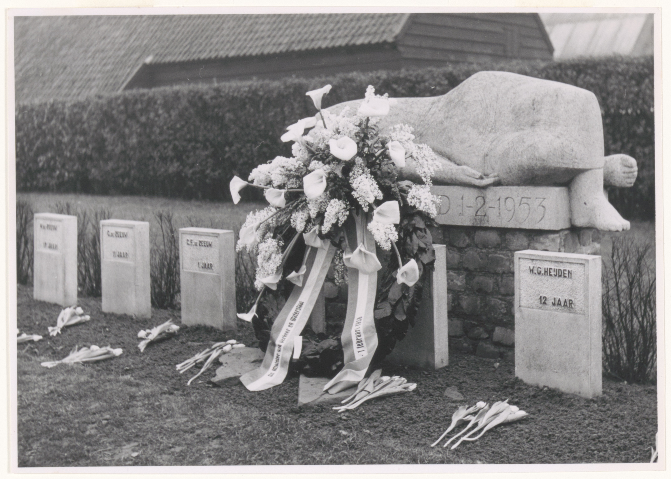 Krans, gelegd tijdens officieel bezoek van minister J. Algera t.g.v. de herdenking van de watersnood.