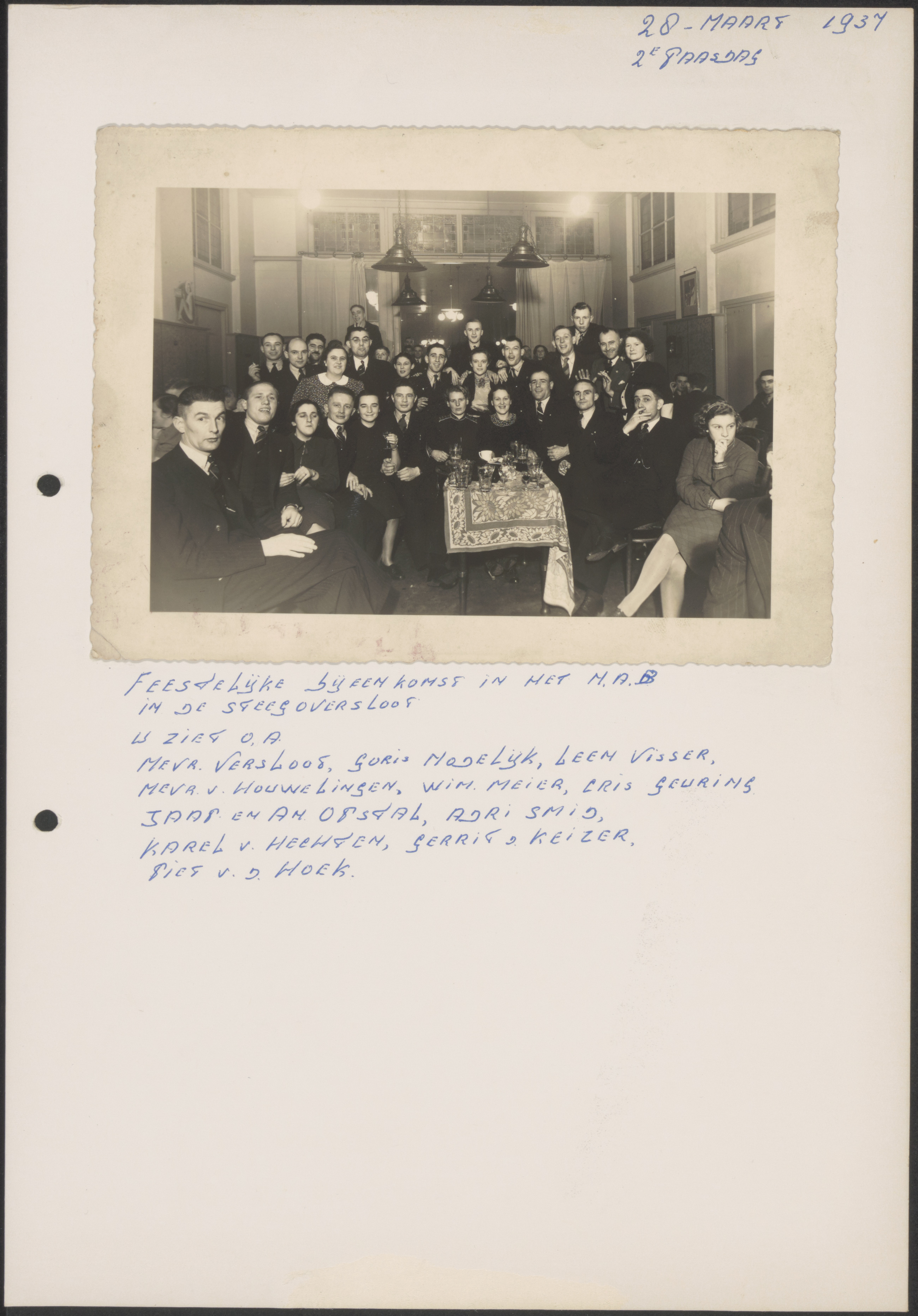 28 maart 1937, tweede Paasdag: Feestelijk bijeenkomst in het N.A.B. in de Steegoverloot, o.a. mevr. Verloot, Goris Nodelijk, Leen Visser, mevr. v. Houwelingen, Wim Meier, Cris Geuring, Jaap en An Opstal, Adri Smid, Karel van Hechten, Gerrit de Keizer, Piet v.d. Hoek;