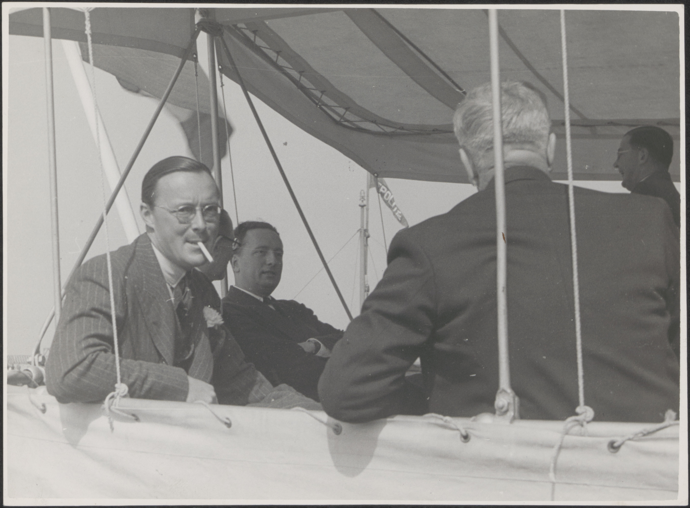 Een zichtbaar ontspannen Prins Bernhard op het achterdek van de boot bij de heropening van de herstelde oorlogsschade aan de Moerdijkspoorbrug.