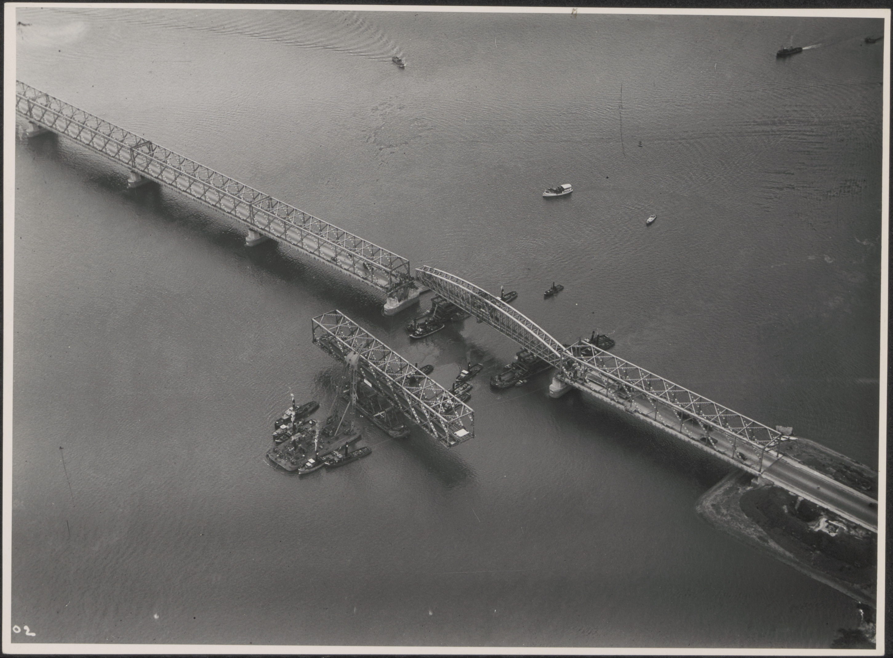 - bruggenbouw drijvende bokken luchtfoto's pontons stoomsleepboten verkeersbruggen
