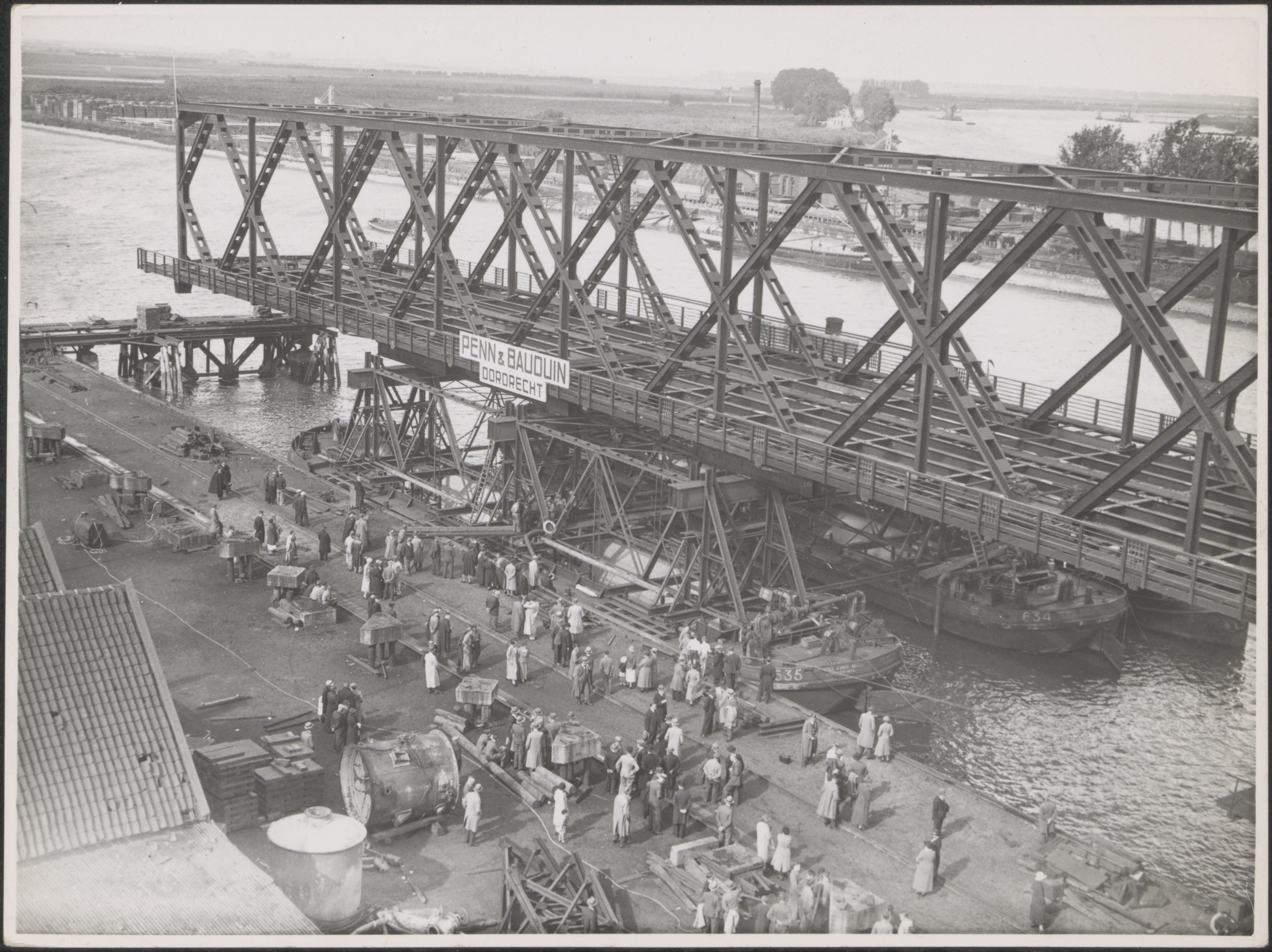 - Onder grote belangstelling verlaat het laatste deel van de Moerdijkbrug de werf van Penn & Bauduin aan de 's-Gravendeelsedijk.