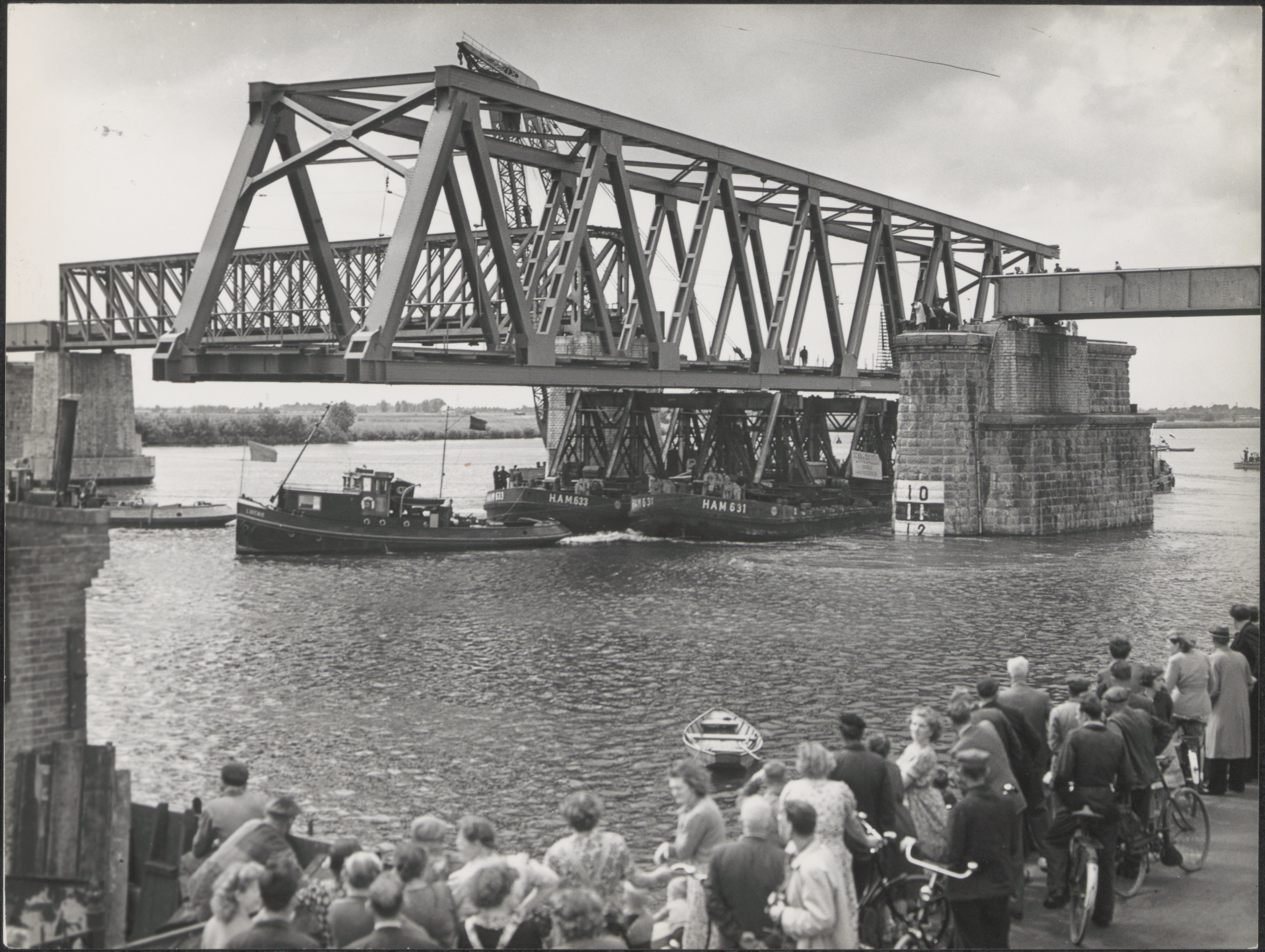 - Het transport van een van de noodbruggen voor de in de Tweede Wereldoorlog beschadigde Moerdijkbrug passeert de Baanhoekbrug in Sliedrecht.