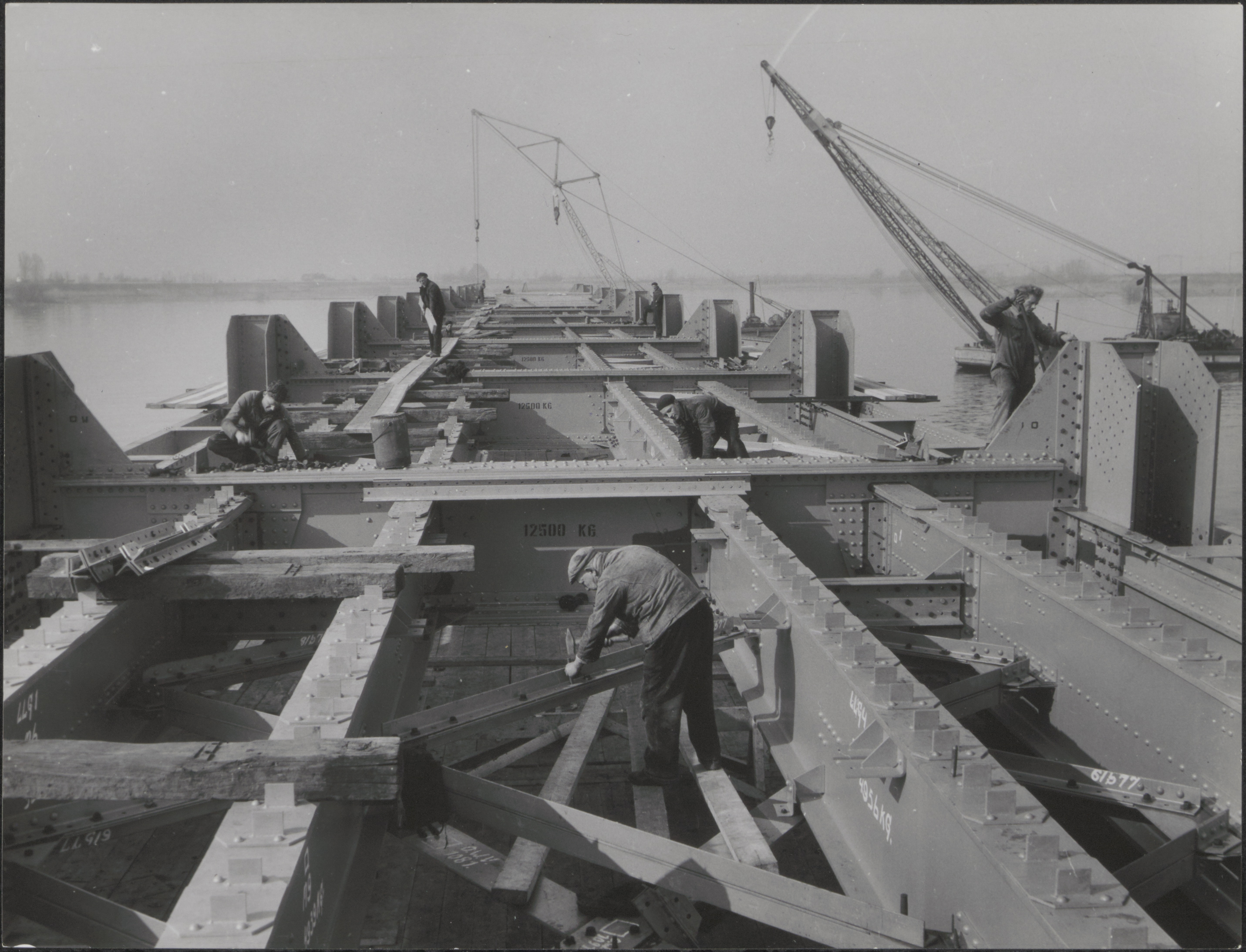 - Delen van de spoorbrug over het Hollandsch Diep worden op locatie samengesteld aan Dordtse zijde, nadat de brug in de Tweede Wereldoorlog was vernield.