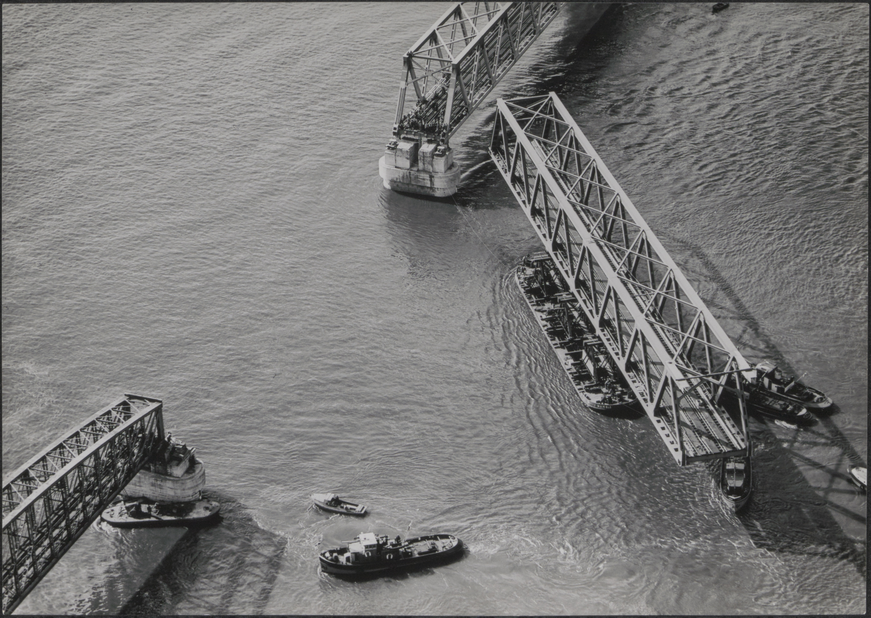 - bruggenbouw luchtfoto's pontons sleepboten spoorbruggen