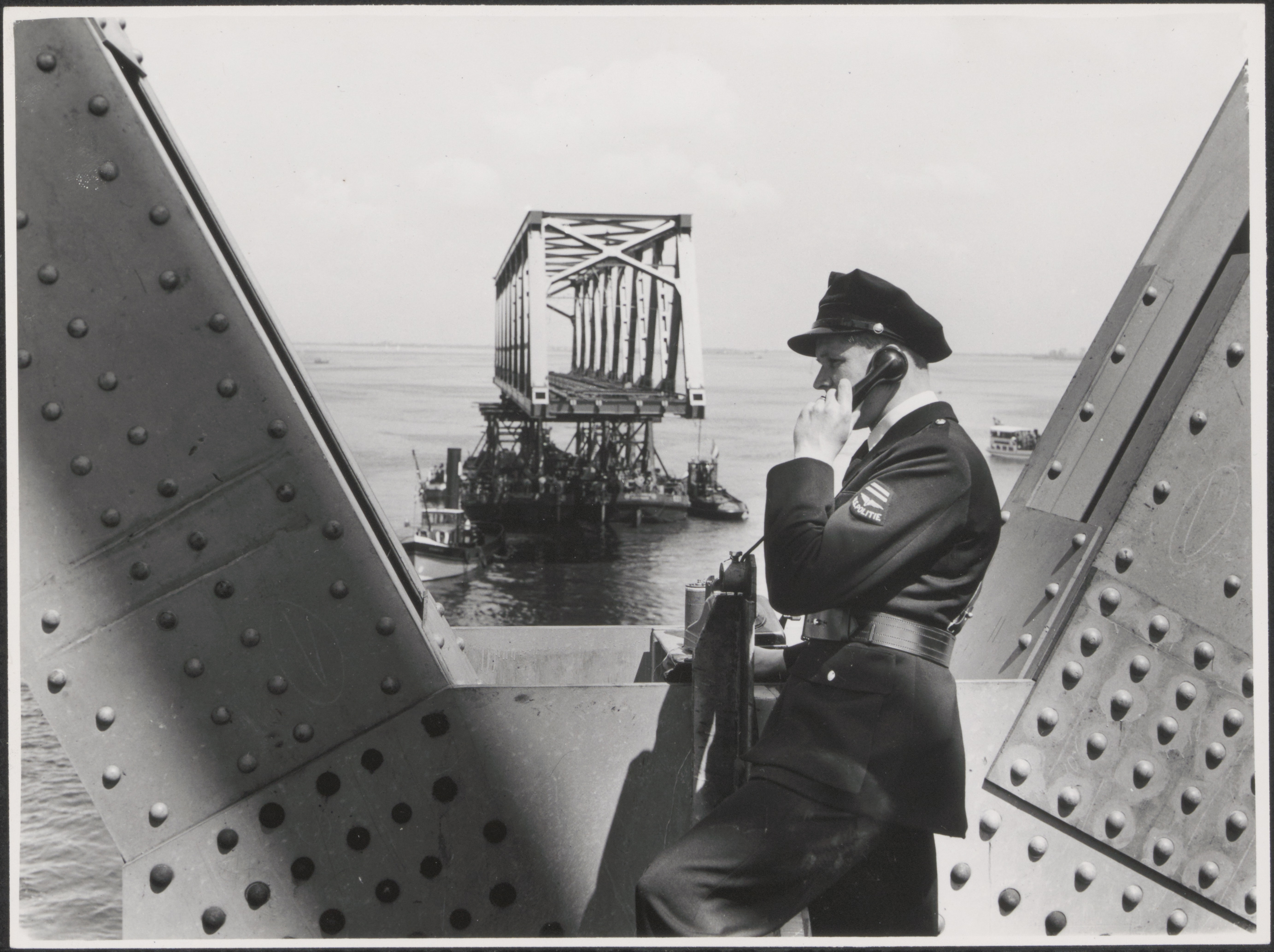 Communicatie van de Rijkspolitie te Water bij herstelwerkzaamheden van de in de Tweede Wereldoorlog beschadigde bruggen over het Hollandsch Diep.