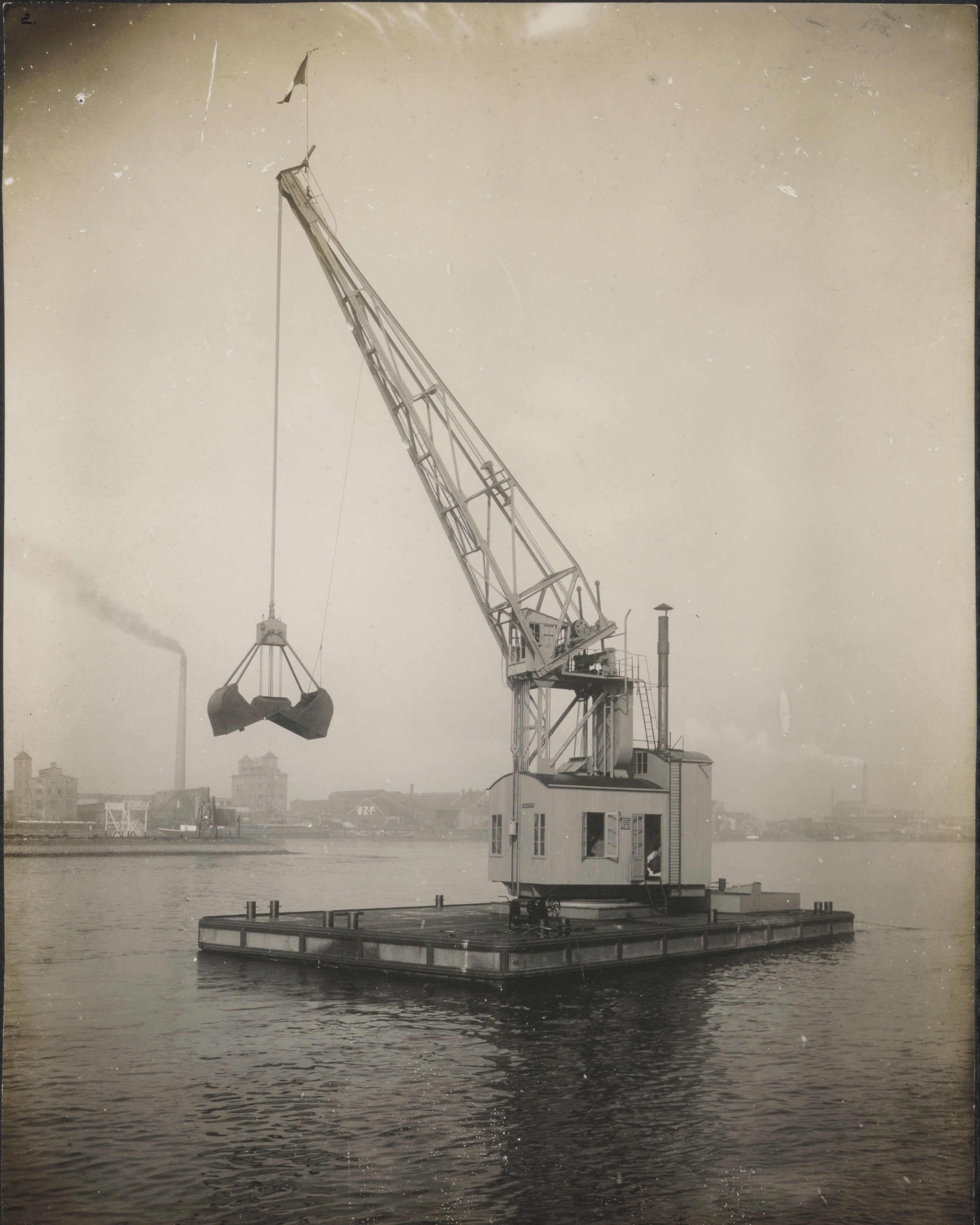 - Een drijvende grijperkraan voor de werf van Penn & Bauduin aan de ‘s-Gravendeelsedijk. Op de achtergrond de olie- en zeepindustrie aan de Lindtsedijk in Zwijndrecht.