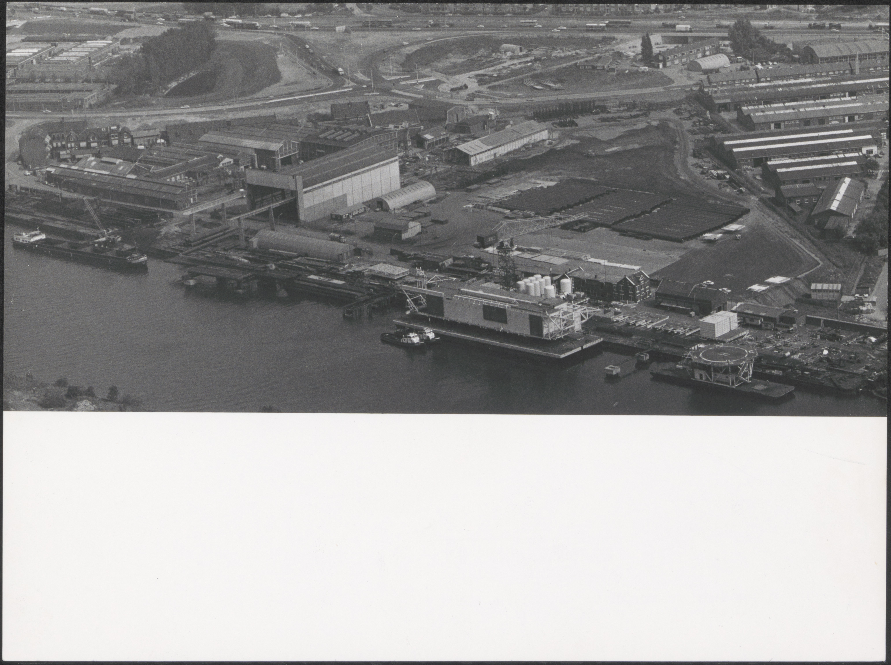 - Penn & Bauduin aan de 's-Gravendeelsedijk. Op pontons in het Mallegat liggen delen voor een boorplatform.