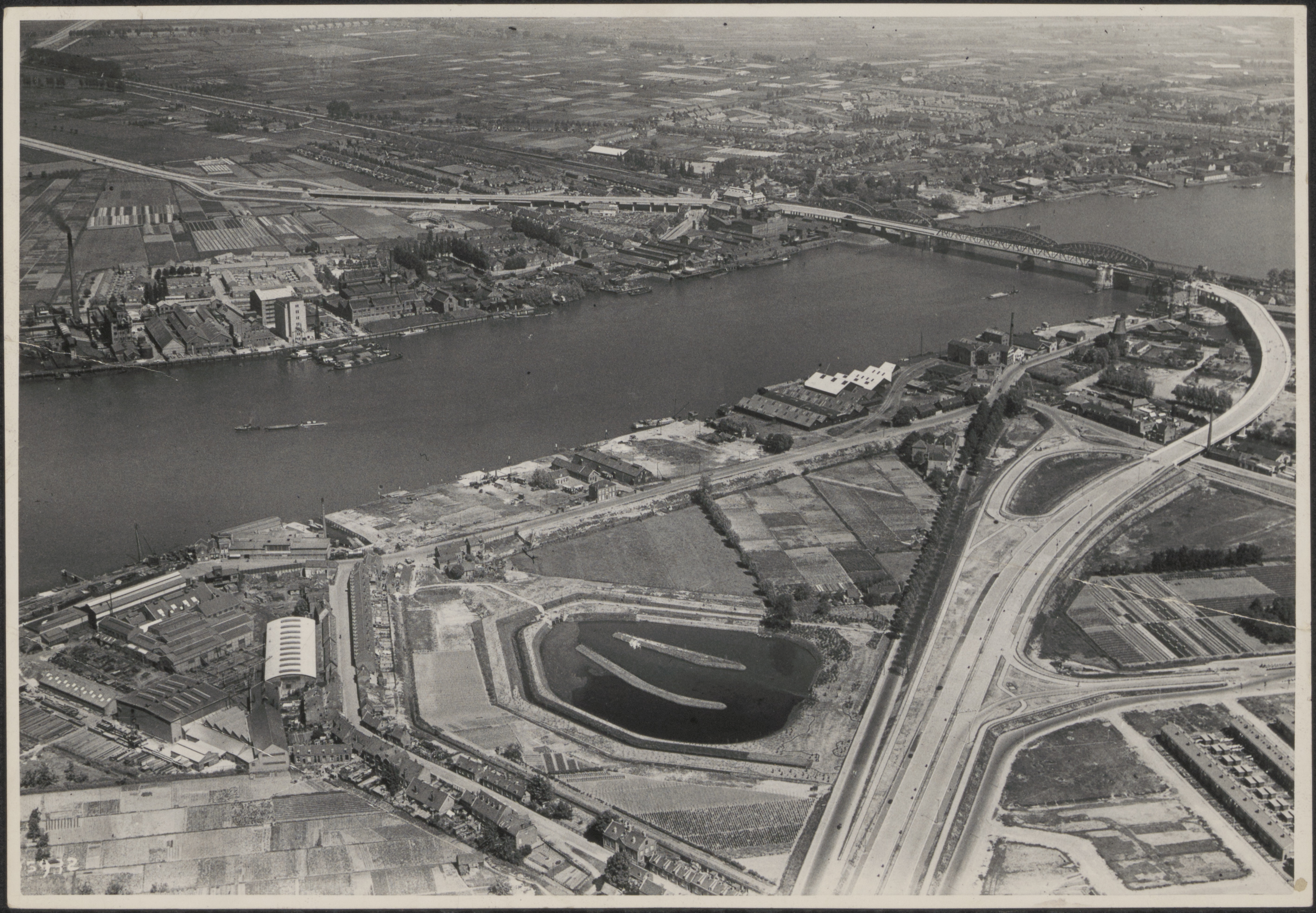 Luchtfoto van het gebied bij de bruggen over de Oude Maas. Linksonder Penn & Bauduin, …