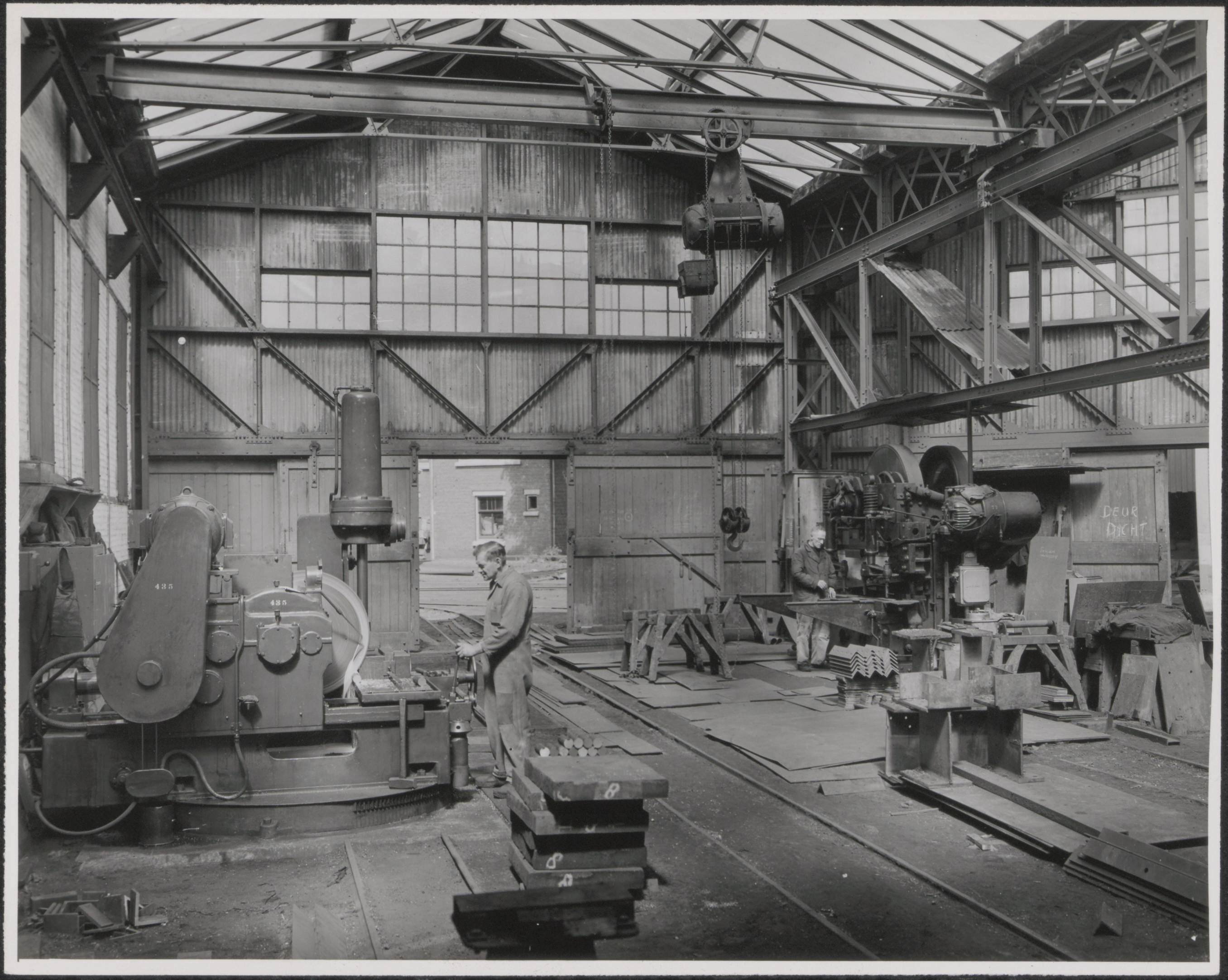 Slijpmachine en guilliotineschaar in een hal van Penn & Bauduin aan de 's-Gravendeelsedijk.