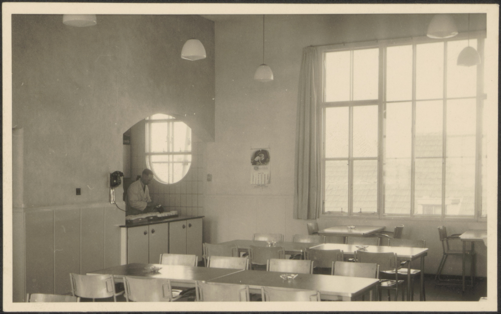 Kantine in het kantoorgebouw van Penn & Bauduin op de hoek 's-Graveneelsedijk / Glazenstraat.