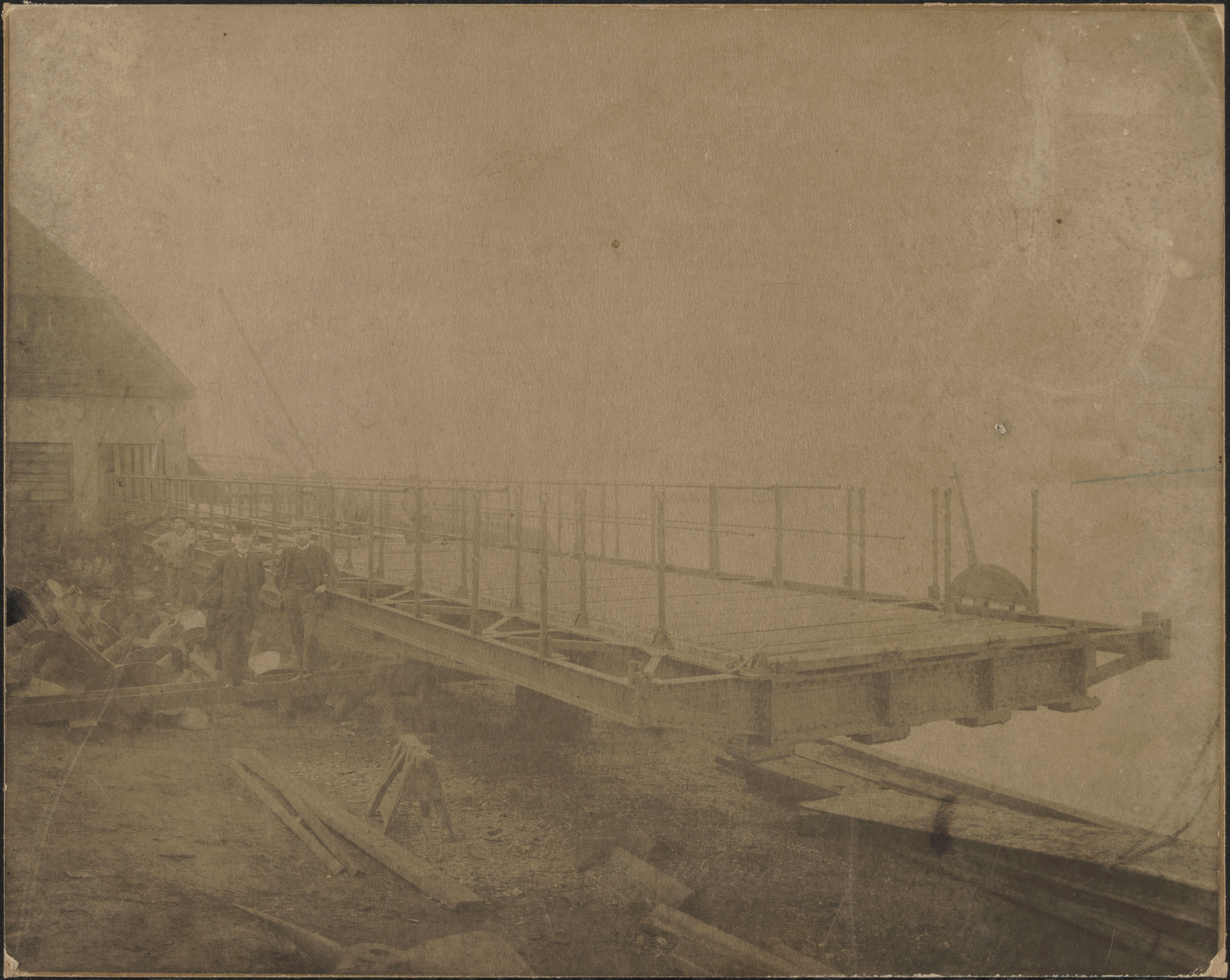 Bouw van een veersteiger op de werf van Penn & Bauduin aan de 's-Gravendeelsedijk.
