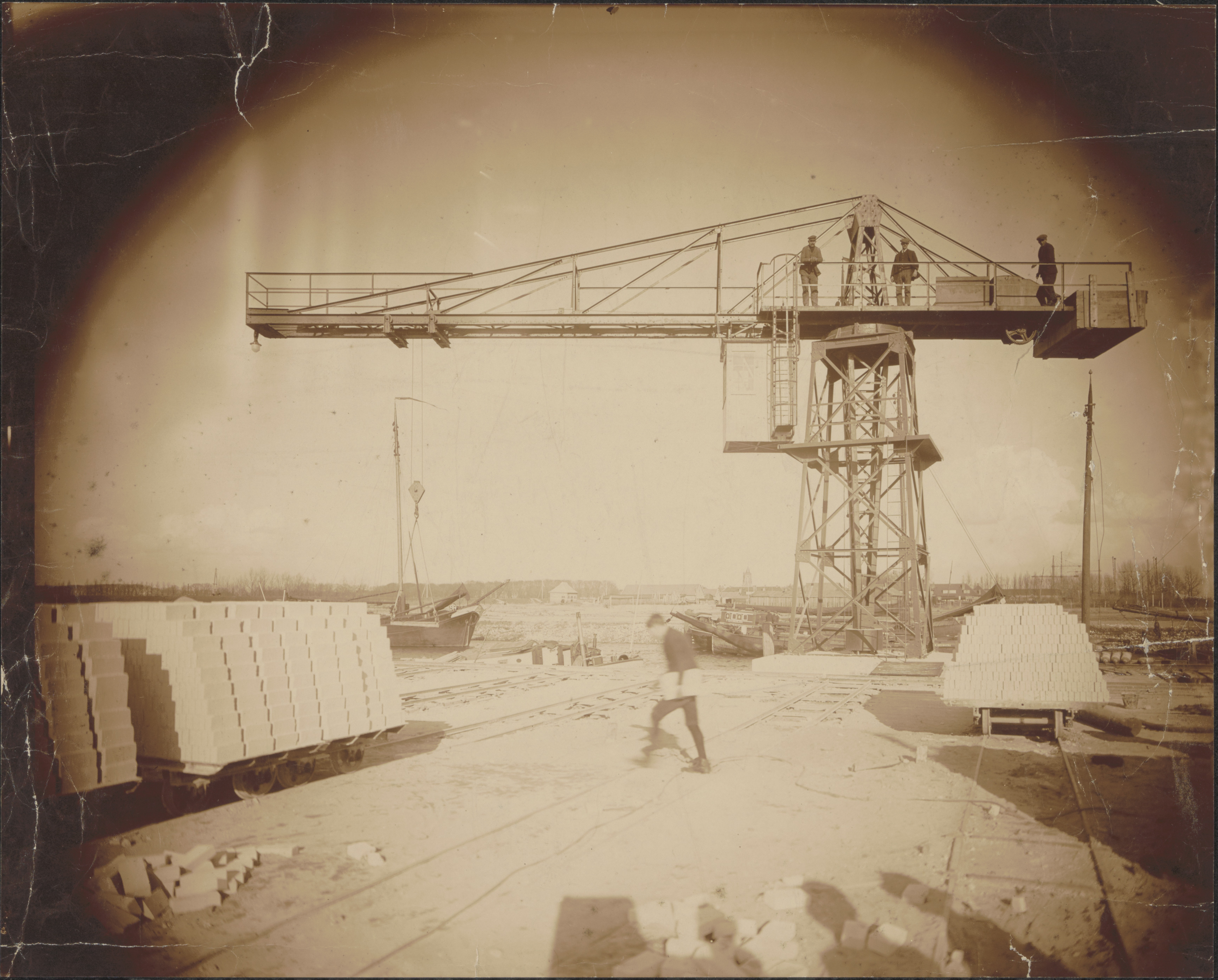 Kraan bij kalkzandsteenfabriek De Merwede (gesticht 1921, gesloten 1980) bij Gorinchem. Links op de achtergrond de Nieuwe Wolpherensedijk, midden aan de horizon de kerktoren van Gorinchem. Rechtsachter de kranen van een scheepswerf aan de Boven-Merwede. De nu gedempte insteekhaven waar de schepen liggen, is te situeren tussen de huidige Timorstraat en Ambonstraat op industrieterrein Avelingen-Oost. Opname kan dus niet ouder dan 1921 zijn, maar het lijkt me ook niet veel later.
