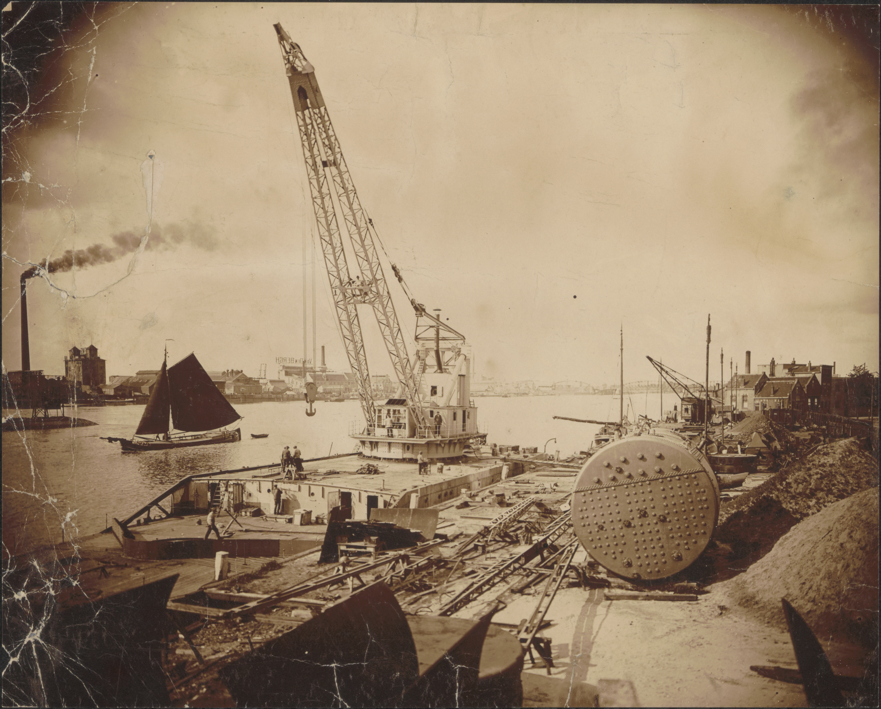 - arbeiders / werklieden fabrieken fabriekspijpen / schoorstenen hijskranen zeilvaartuigen
