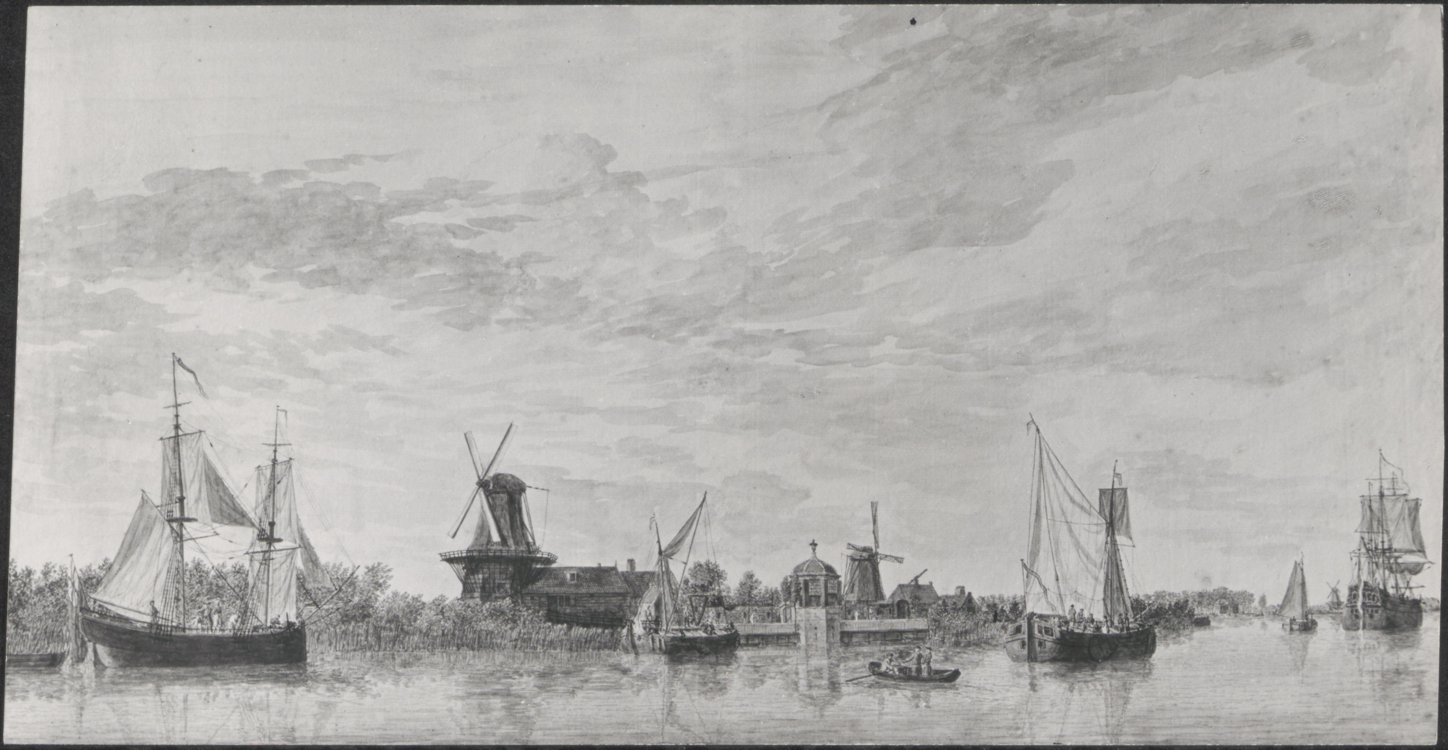 - Gezicht op de oliemolens De Reiger (links) en Het Fortuin op Krabbegors, het eiland gevormd door Oude Maas, Krabbe en Mallegat.