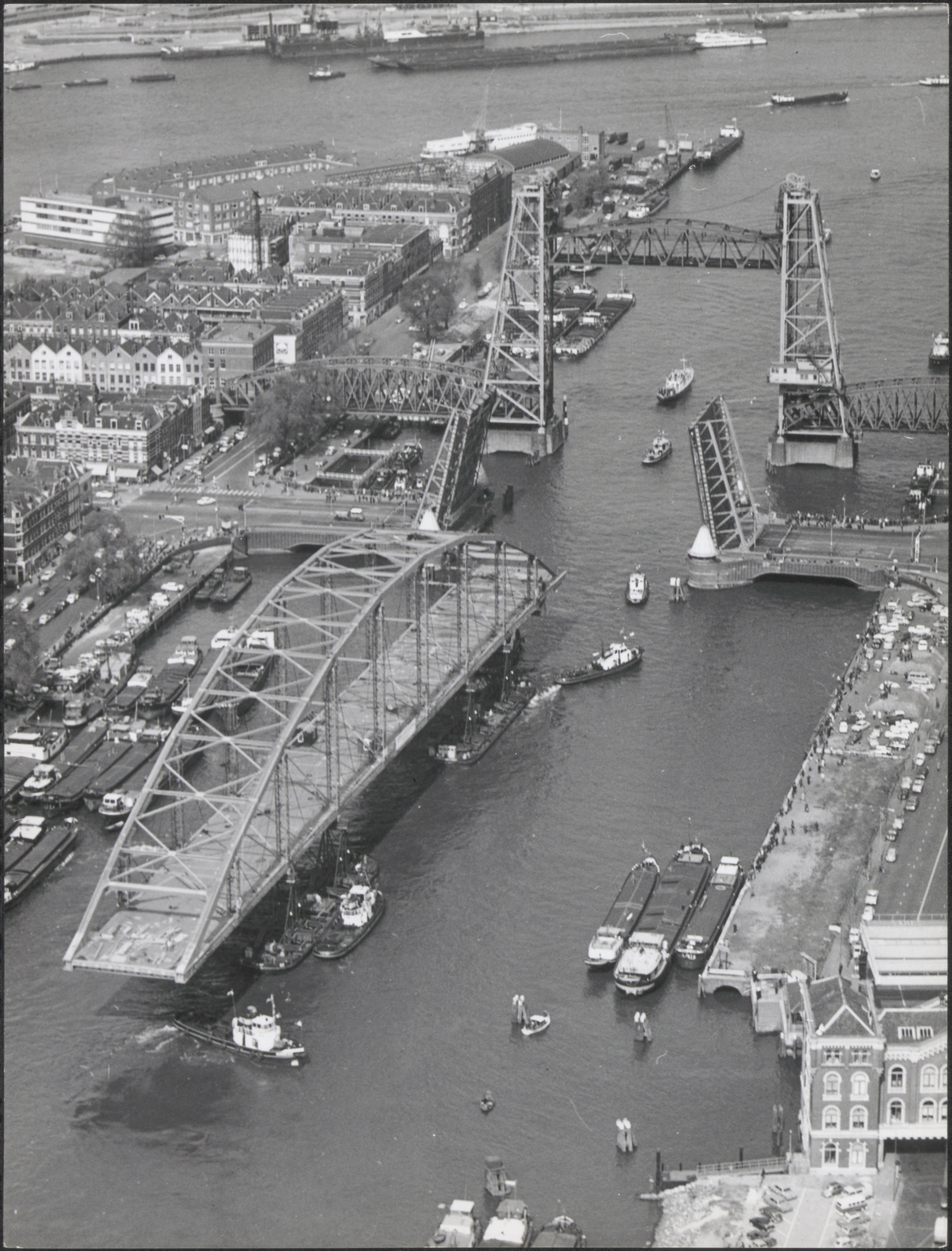 - Vervoer van de bij Penn & Bauduin gebouwde Papendrechtse brug via Rotterdam naar de Beneden Merwede. Het transport bevindt zich in de Rotterdamse Koningshaven en passeert de Koninginnebrug en de Koningshavenbrug (De Hef).
