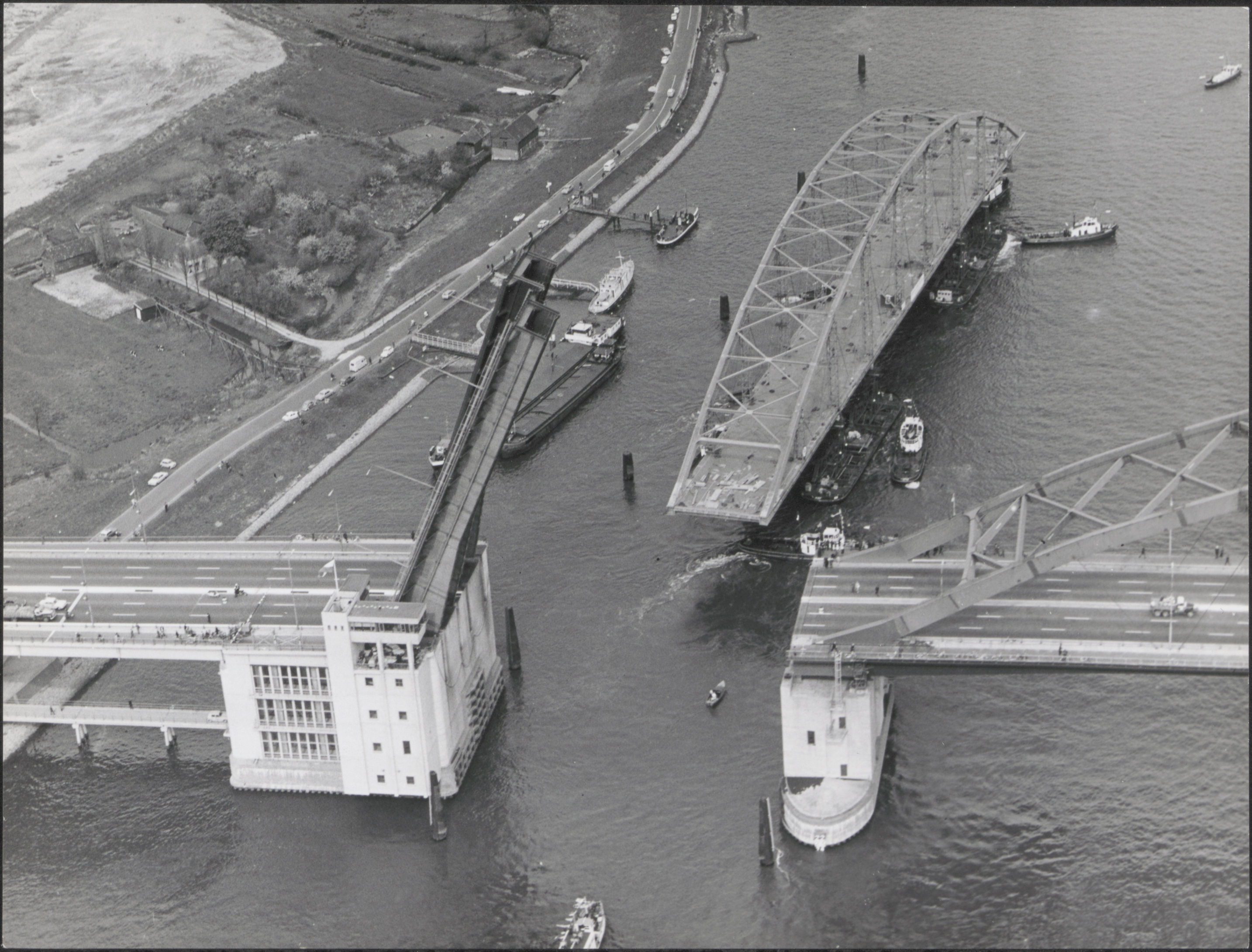 Het transport van de Papendrechtse brug passeert de Van Brienenoordbrug over de Nieuwe …