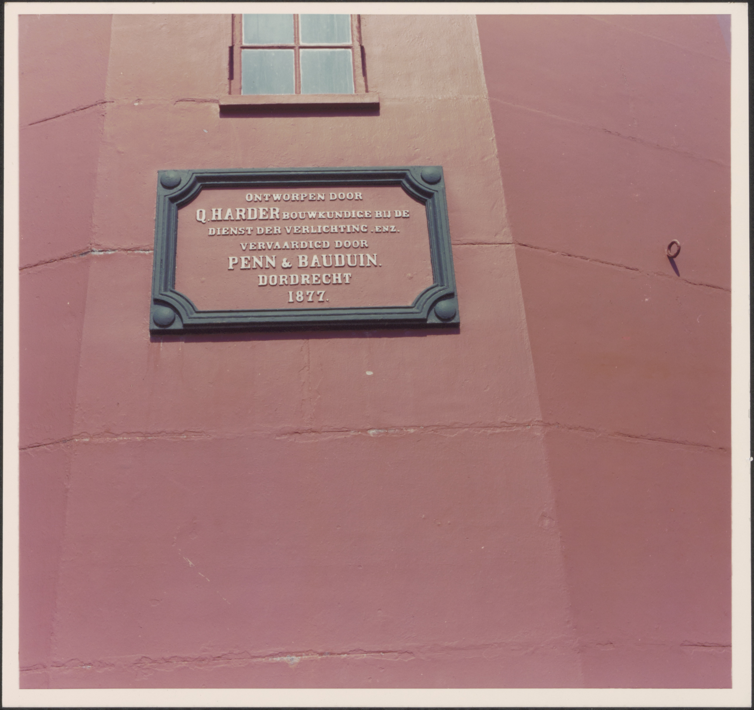 Naamplaat op de door Penn & Bauduin gebouwde vuurtoren Lange Jaap in Den Helder.