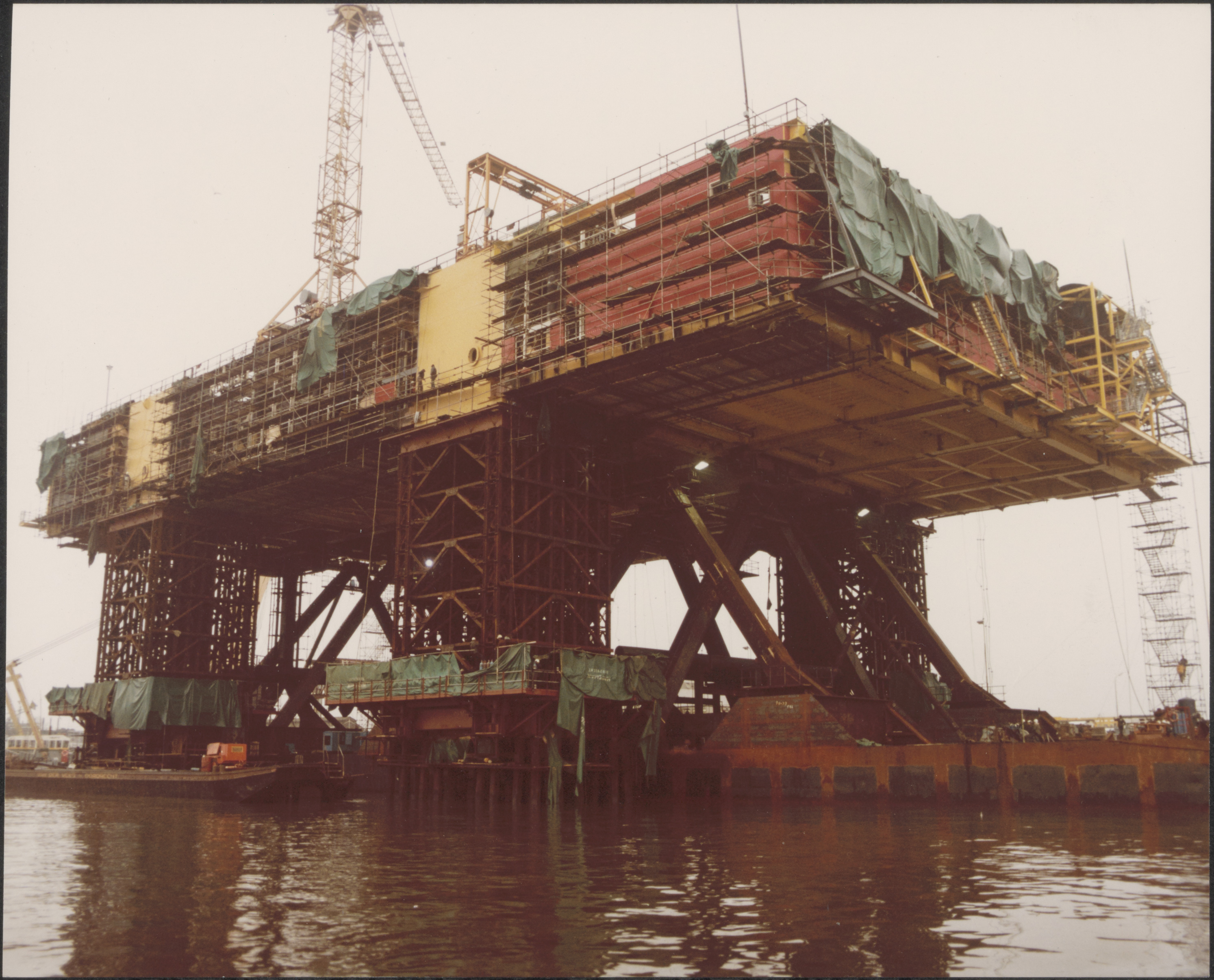 - Boorplatform Brent Charlie (gewicht ca. 1200 ton) is voor de afwerking op pontons met ondersteuningsconstructie geplaatst nog wordt gewerkt, b.v. aan de wandbeplating.