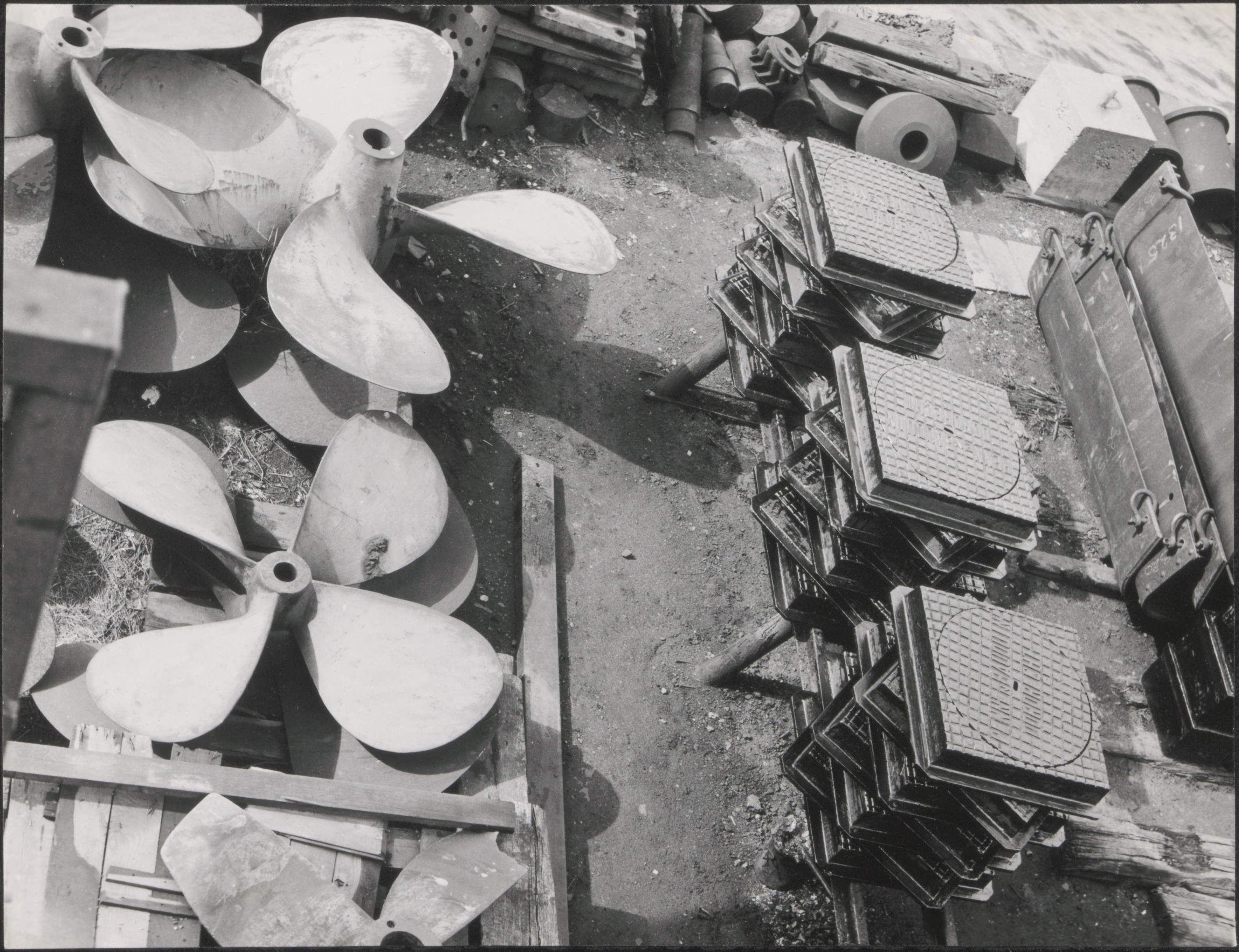 Scheepsschroeven en putdeksels op de werf van Penn & Bauduin aan de 's-Gravendeelsedijk.