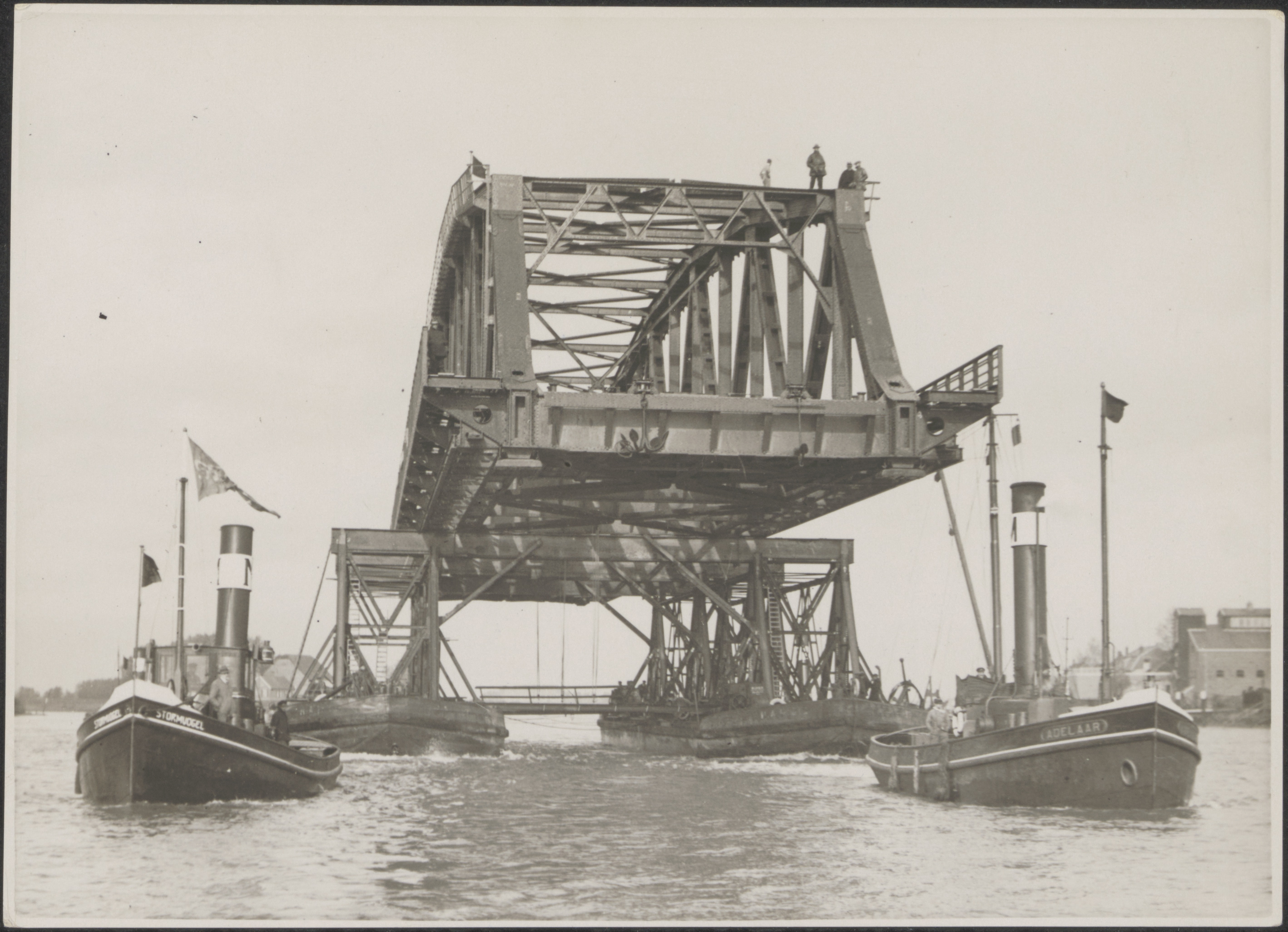 - Eén van de drie overspanningen voor de verkeersbrug over de Bergsche Maas bij Keizersveer is vertrokken vanaf de werf van Penn & Bauduin en vaart op de Dordtse Kil ter hoogte van ‘s-Gravendeel. Rechts bebouwing in Wieldrecht.