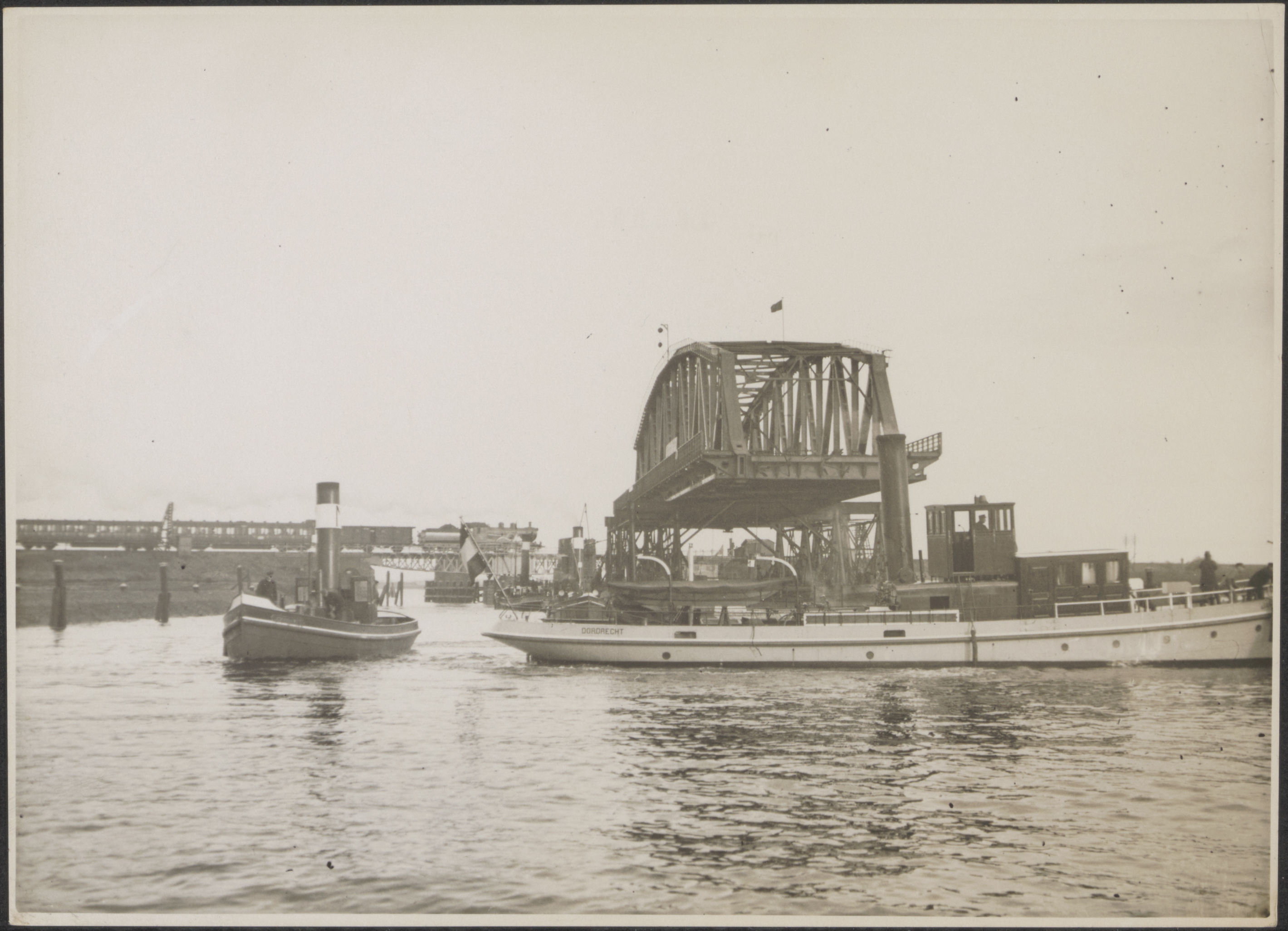 - Transport over het Hollandsch Diep door de draaibrug van spoorbrug Moerdijk van een brugdeel voor de in aanbouw zijnde brug te Keizersveer.