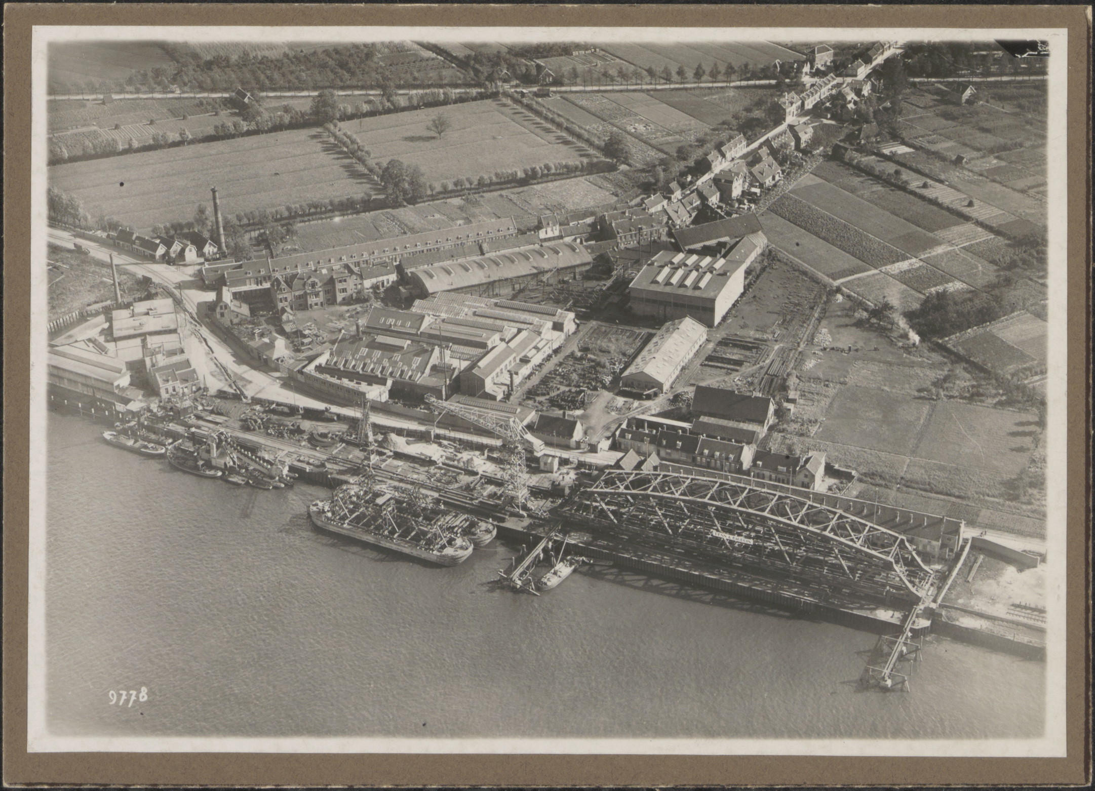 Luchtfoto van de werf van Penn & Bauduin aan de ‘s-Gravendeelsedijk met een brugdeel …