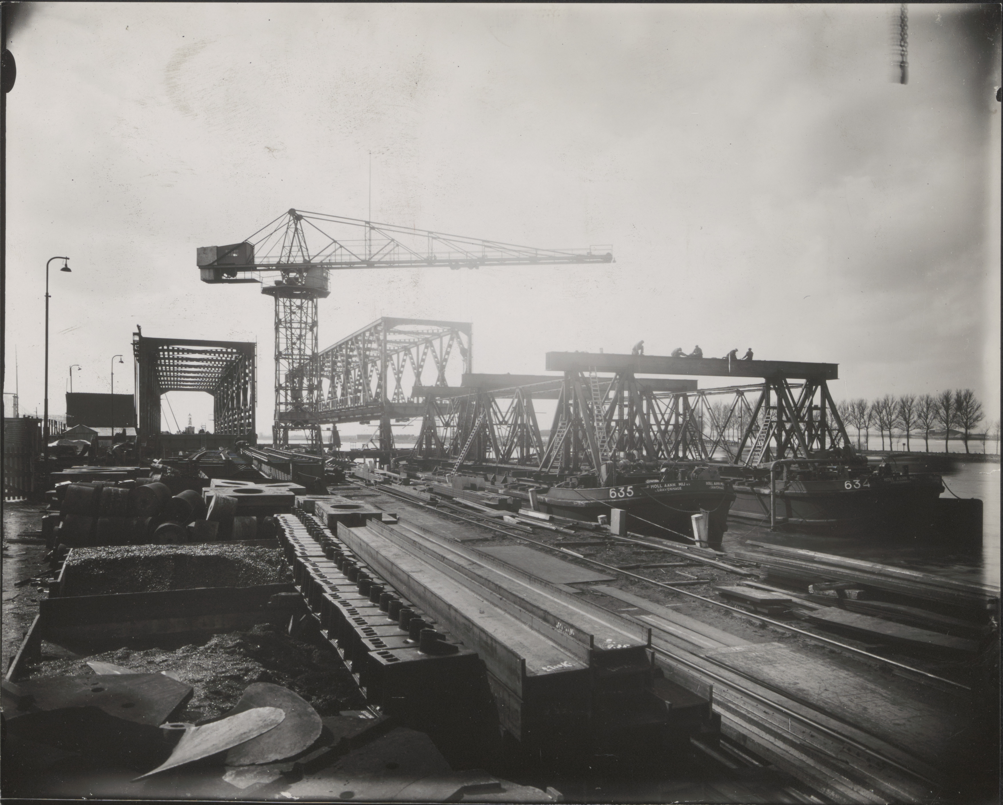- De werf van Penn & Bauduin aan de 's-Gravendeelsedijk tijdens de bouw van de verkeersbrug Moerdijk.