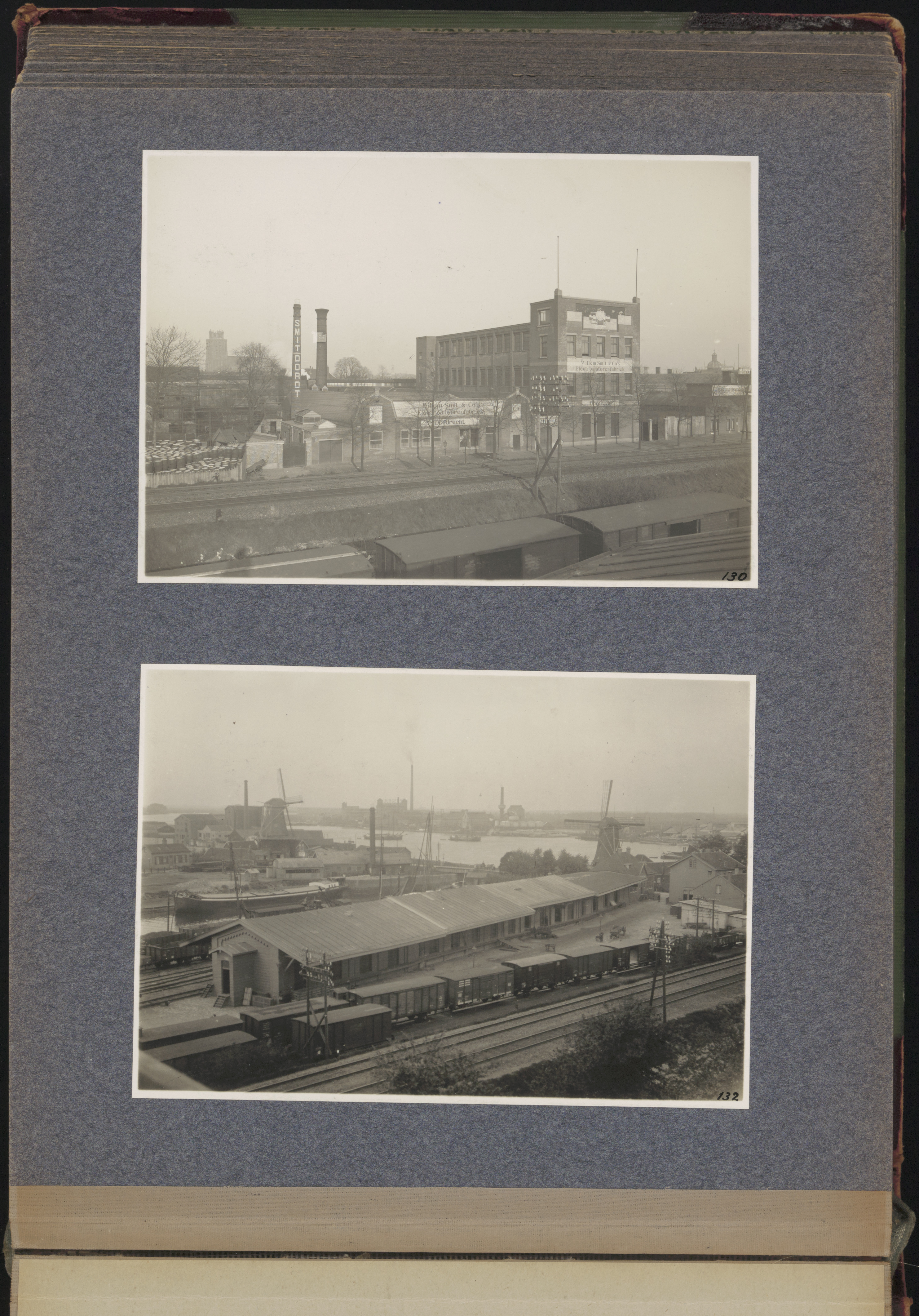 2 panorama's uit de periode 1911-1919 (dit volgt uit de omslag van dit fotoboek op 318_1001). Boven: de E.M.F. aan de Korte Parallelweg vanaf het dak van de goederenloods van de spoorwegen aan de 's-Gravendeelsedijk. Beneden: van het dak van de E.M.F. naar het zuidwesten met de goederenloods van de spoorwegen middenvoor, de spoorweghaven, molen De Zeelt rechts, molen De Pelikaan links, Oude Maas en fabrieken aan de 's-Gravendeelsedijk en in Zwijndrecht (V.O.Z.) op de achtergrond.