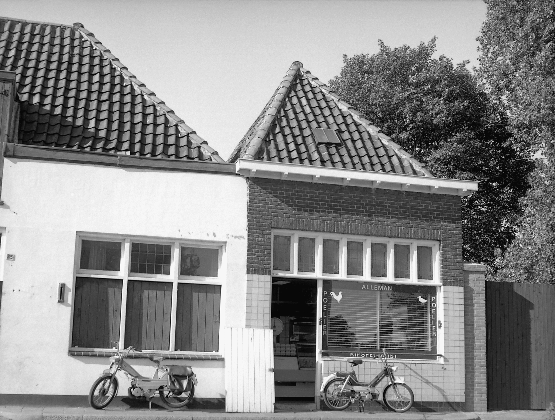 Joop de Kip (Joop Alleman), poelier was in het rechter pand voor en na de oorlog (1940-1945)hier gevestigd en links ervan Dirk Markestein (later zijn zoon Ties of Tinus) handel in oude metalen.