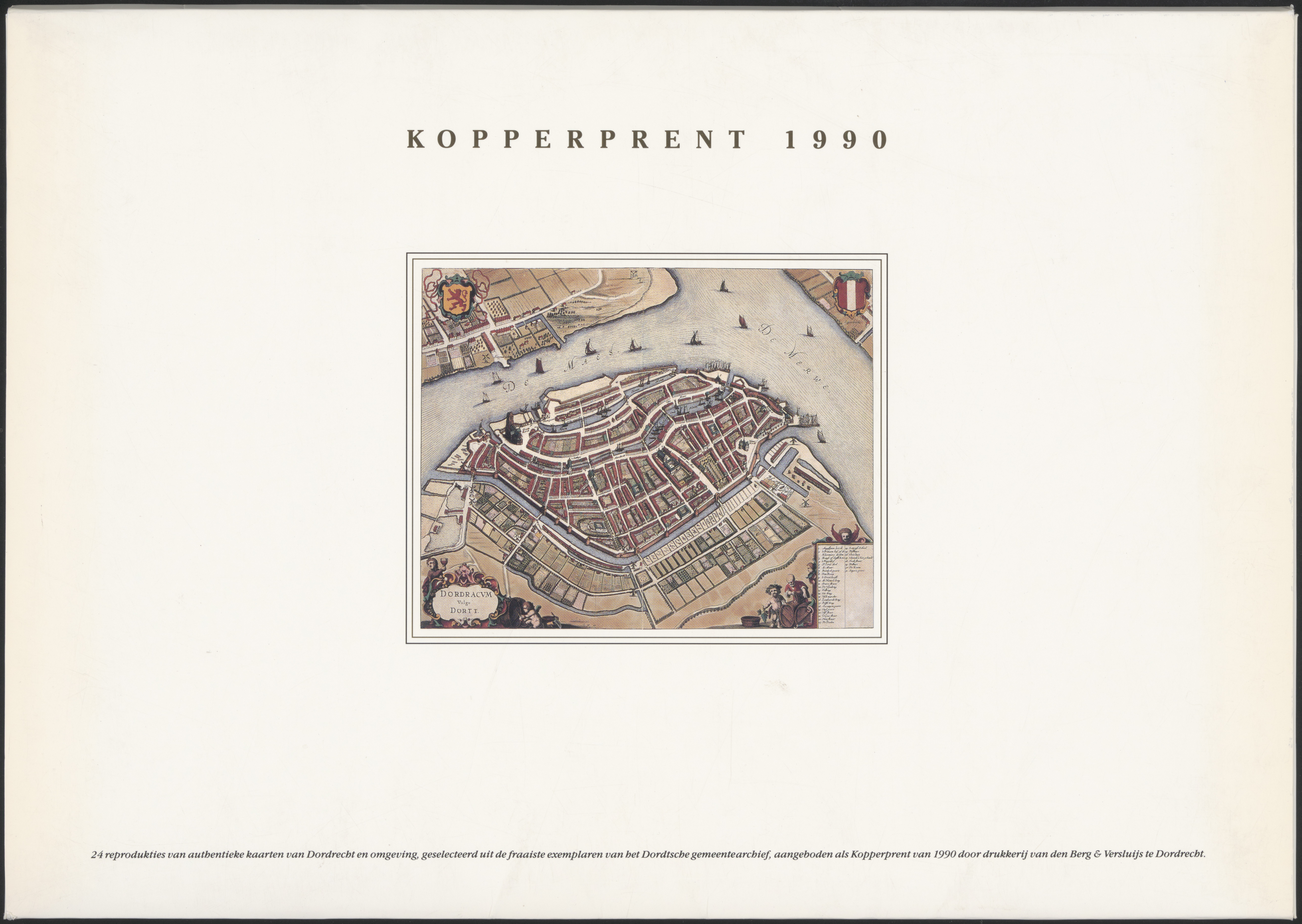 Uitgereikt op 8 januari 1990 aan Burgemeester J. Noorland in het Stadhuis van Dordrecht. Naar een idee van Jan Alleblas m.m.v. P. Schotel en G. Renting. Gedrukt door Drukkerij Van den Berg & Versluijs, Dordrecht. Lithografie door Fotolitho Dordrecht. Zie verder de beelden onder Inventarisnummer 552_195121