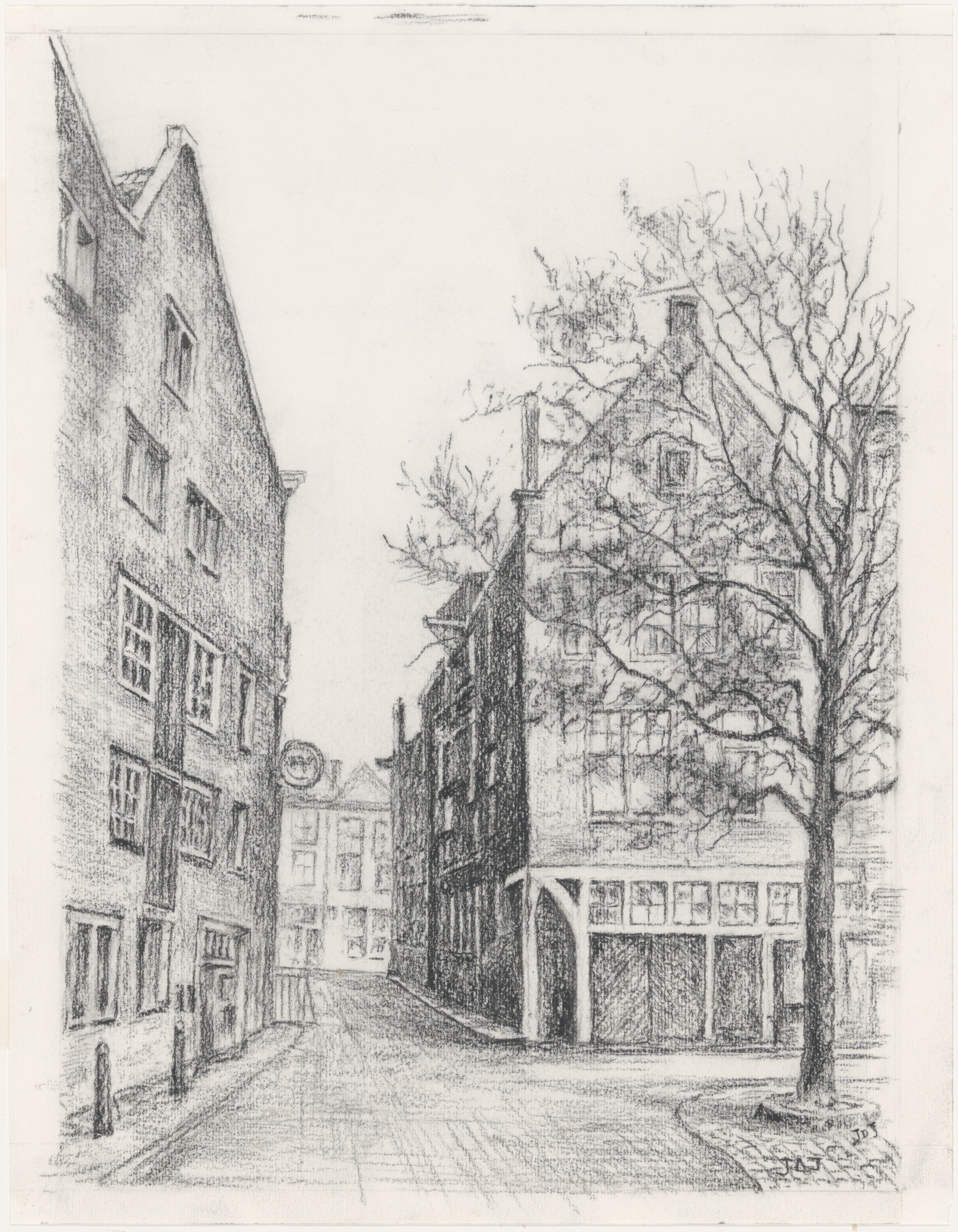 - Tekening van de Grote Kalkstraat richting Prinsenstraat vanaf de Korte Kalkhaven. Rechts de Keizershof.