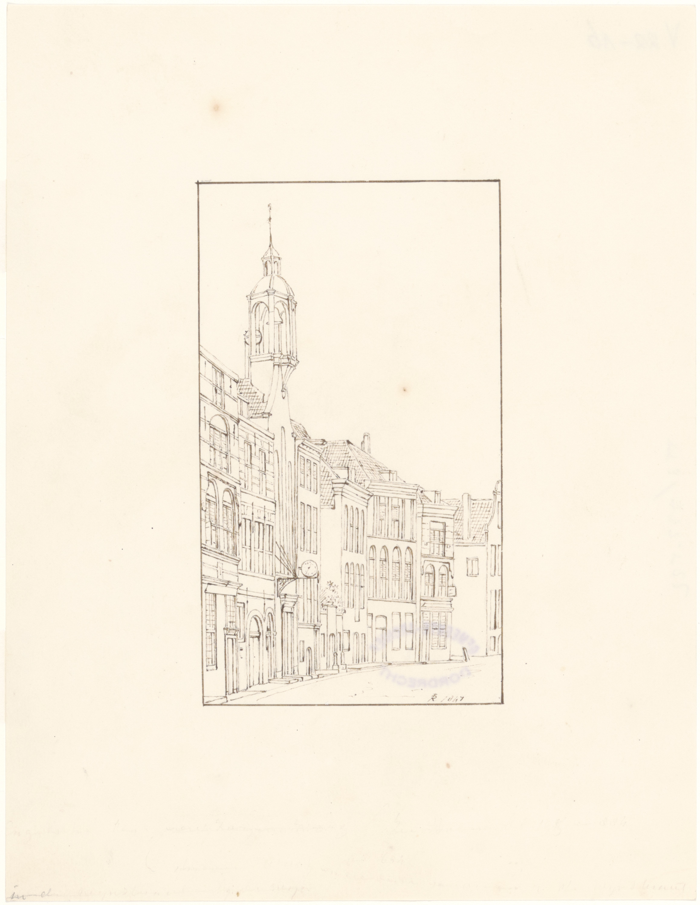Tekening van de Wijnstraat tussen de Wijnbrug en de Botermarkt.