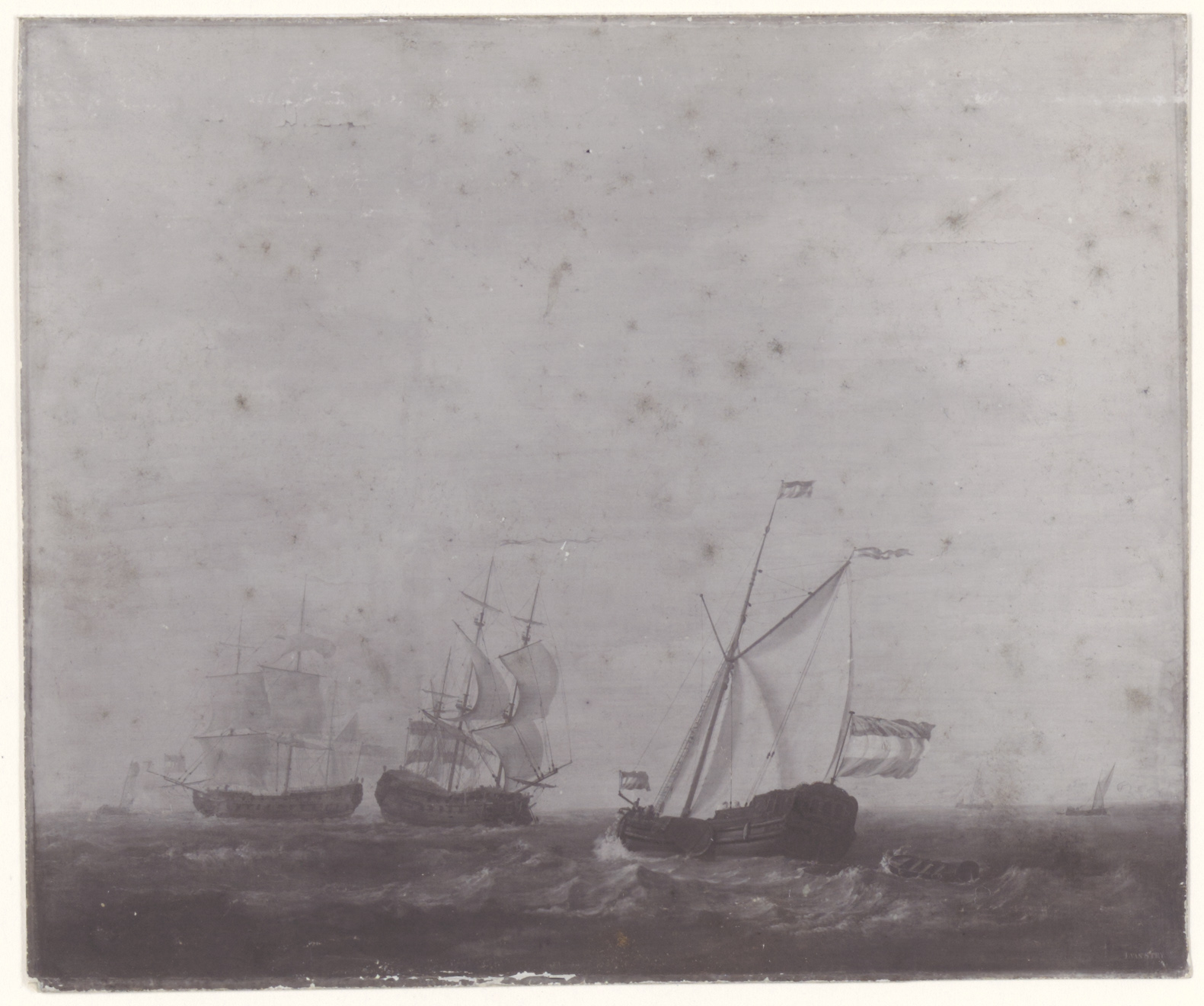 Het jacht van de Kamer Rotterdam van de VOC begroet een Rotterdamse oostindiëvaarder en een Nederlands oorlogsschip op de rede van Hellevoetsluis, rechtsonder gesigneerd 'J. van Strij', nu in Maritiem Museum, Rotterdam De foto toont het oorspronkelijke formaat (deel van de lucht is afgesneden).