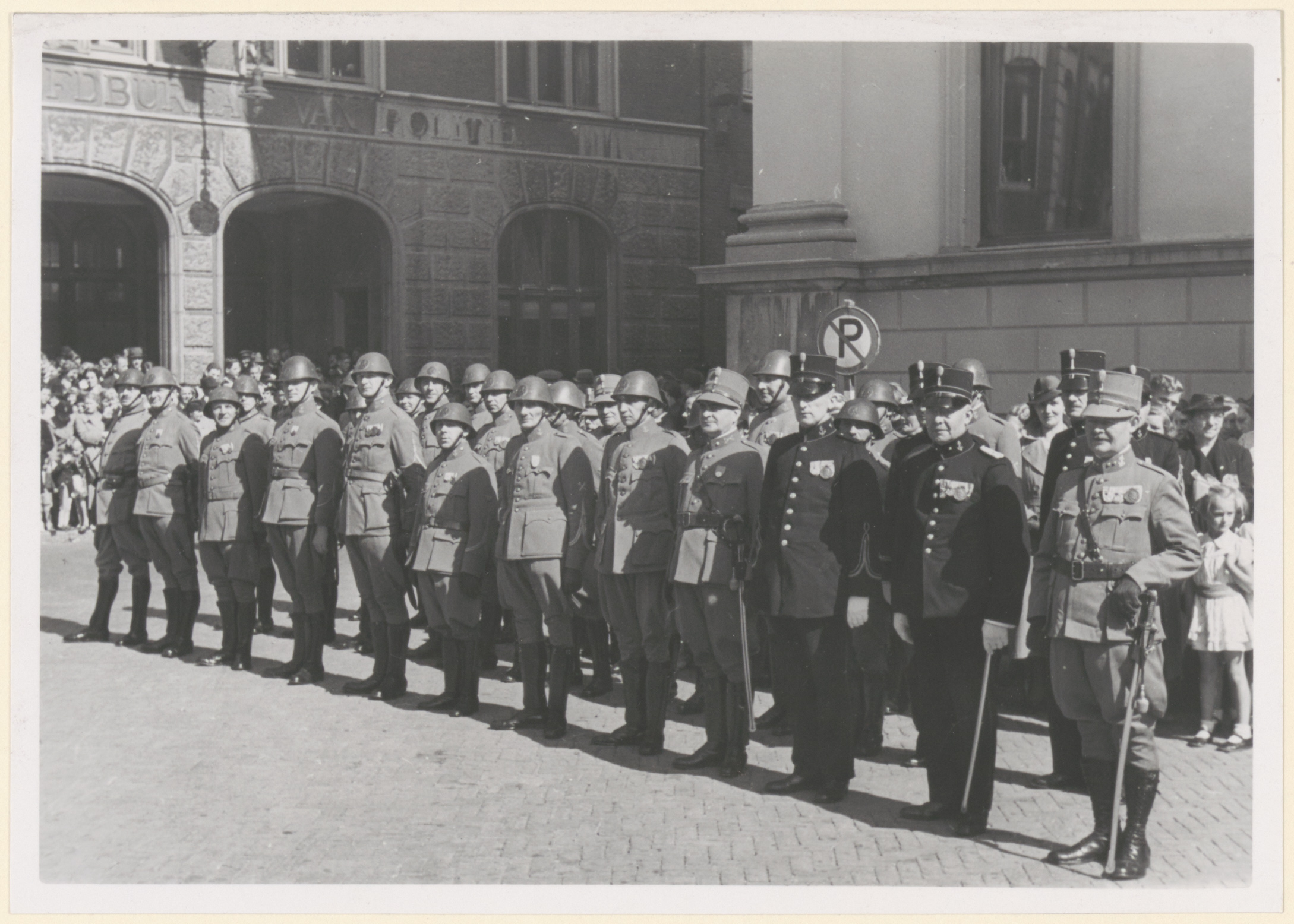 Parade voor het stadhuis door niet-ingedeelde onderofficieren van het Korps Pontonniers …