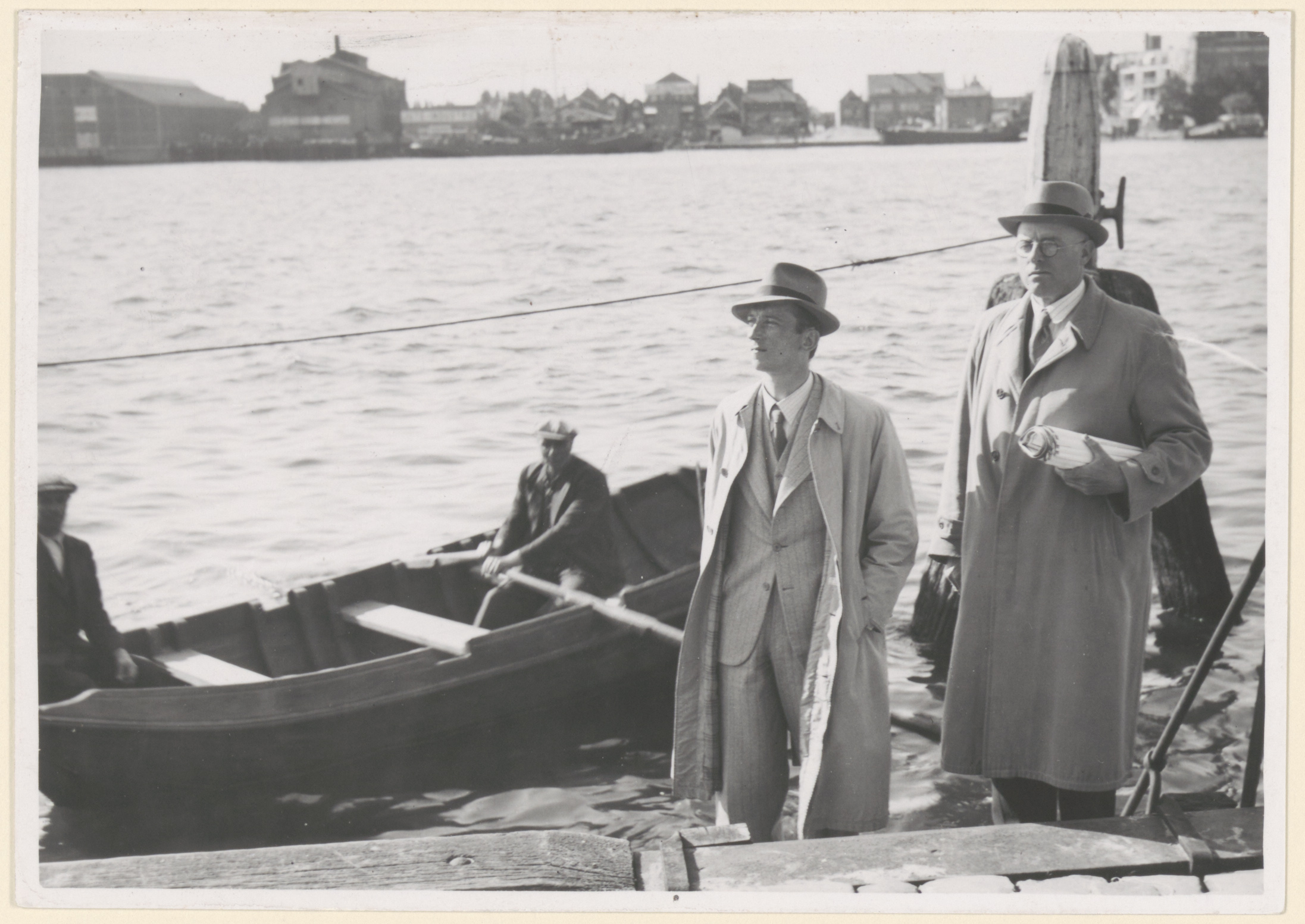 Mr. W. Gorter en J.G. van Namen arriveren per roeiboot uit Zwijndrecht op de Hooikade. …