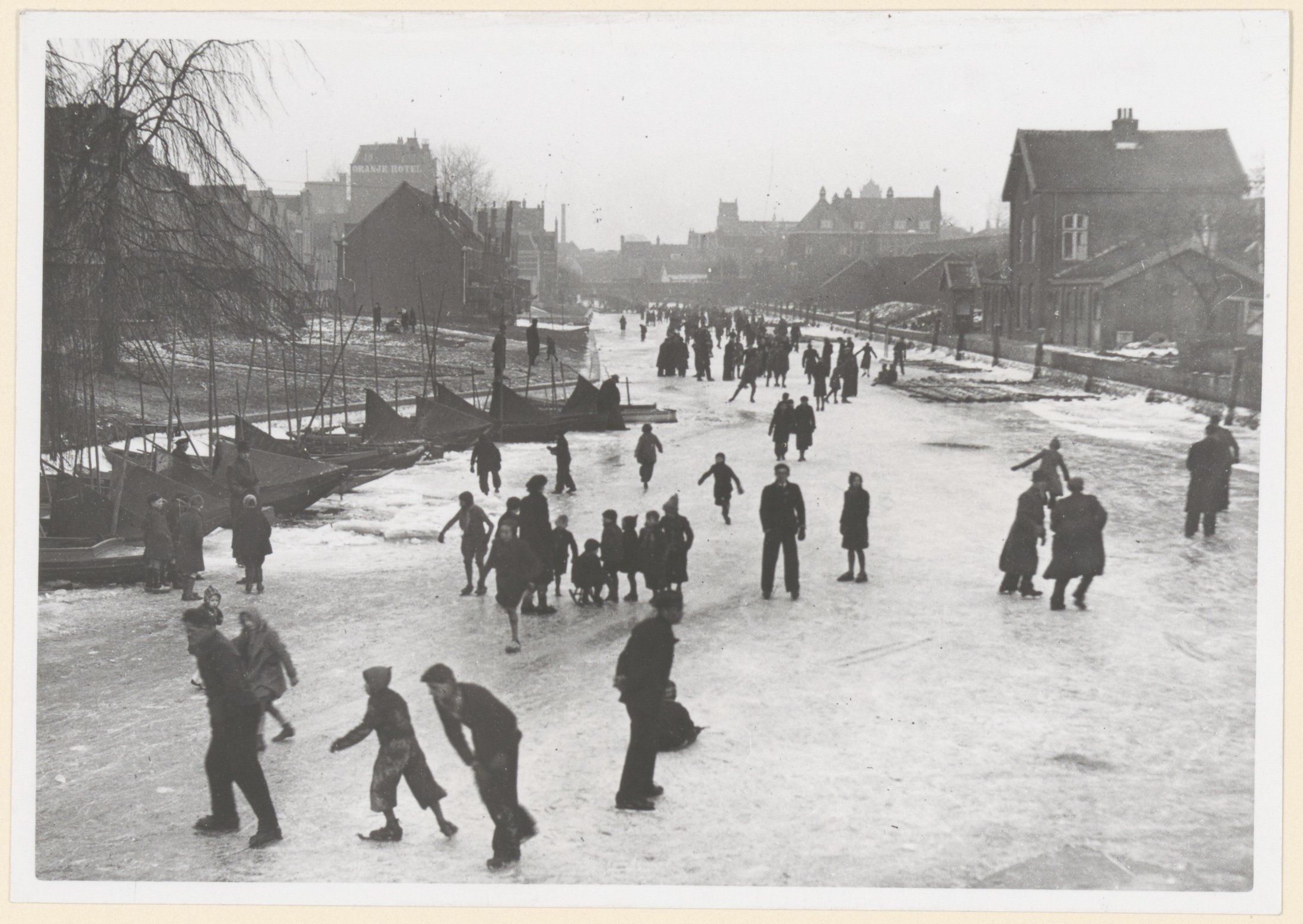 - IJspret op de Spuihaven, gezien vanaf de Spuibrug in de richting van de Johan de Wittbrug. Links loopt de Vest; het hoge gebouw aan het eind is het Oranjehotel. Rechts achter het hoge woonhuis begint Achterlandswerf.