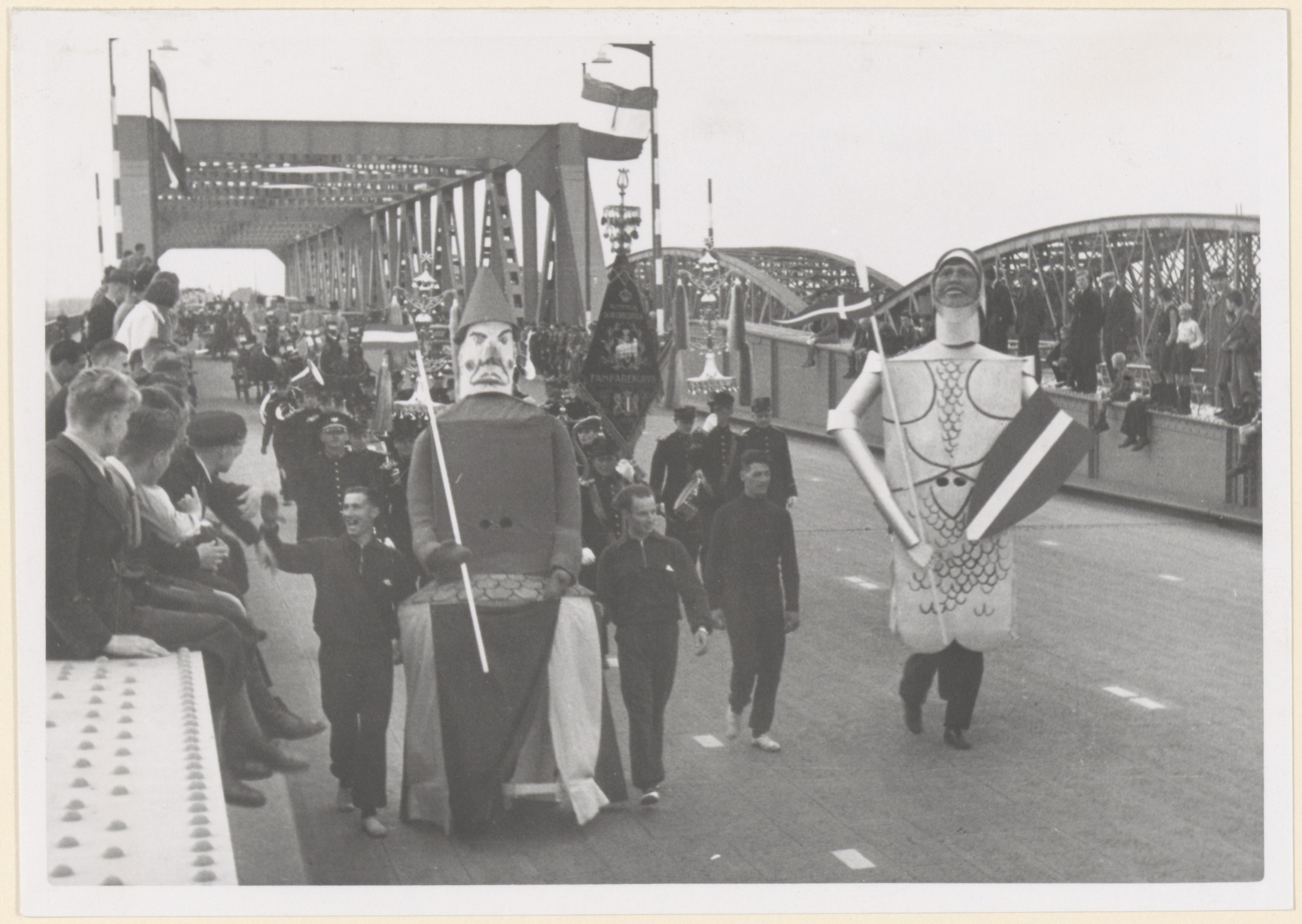 - Tafereel uit de optocht bij de brugfeesten t.g.v. de opening van de verkeersbrug over de Oude Maas. Rechts ligt de spoorbrug.