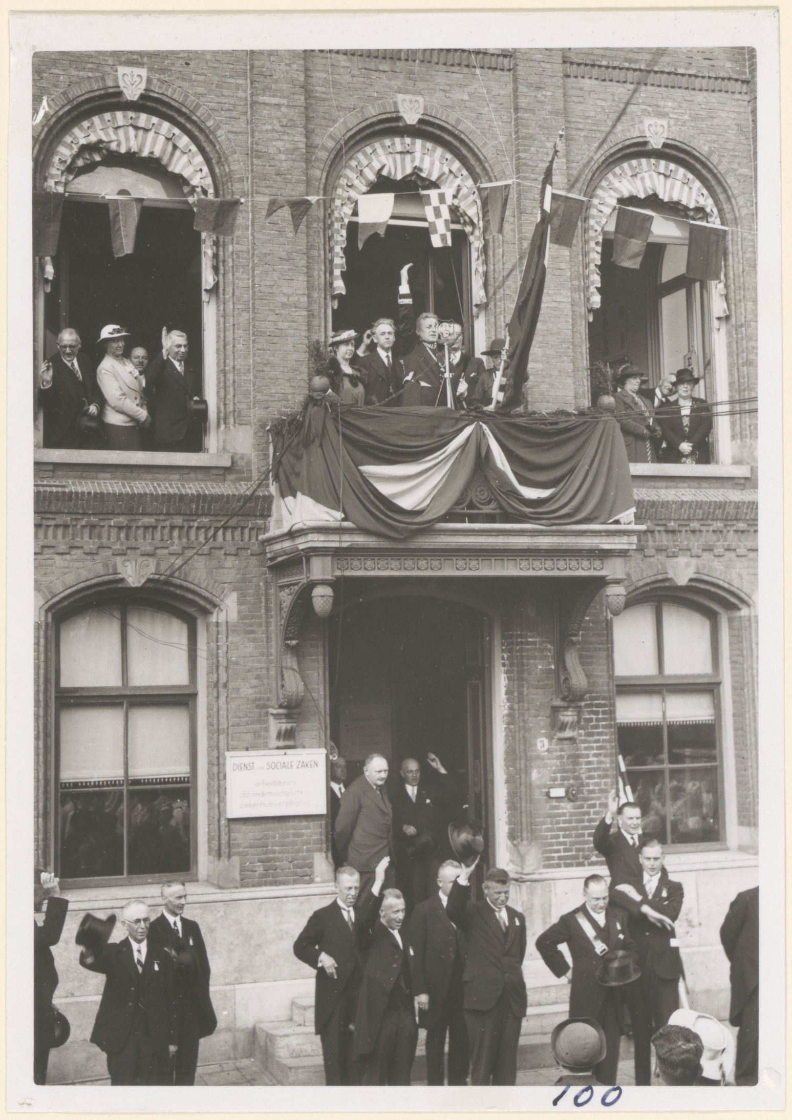 - Burgemeester Bleeker overhandigt op het Beverwijcksplein de officiële Dordtse vlag, die de deputatie der jeugdvereniging mee zal nemen naar de huldiging voor het 40-jarig regeringsjubileum van koningin Wilhelmina in Amsterdam.