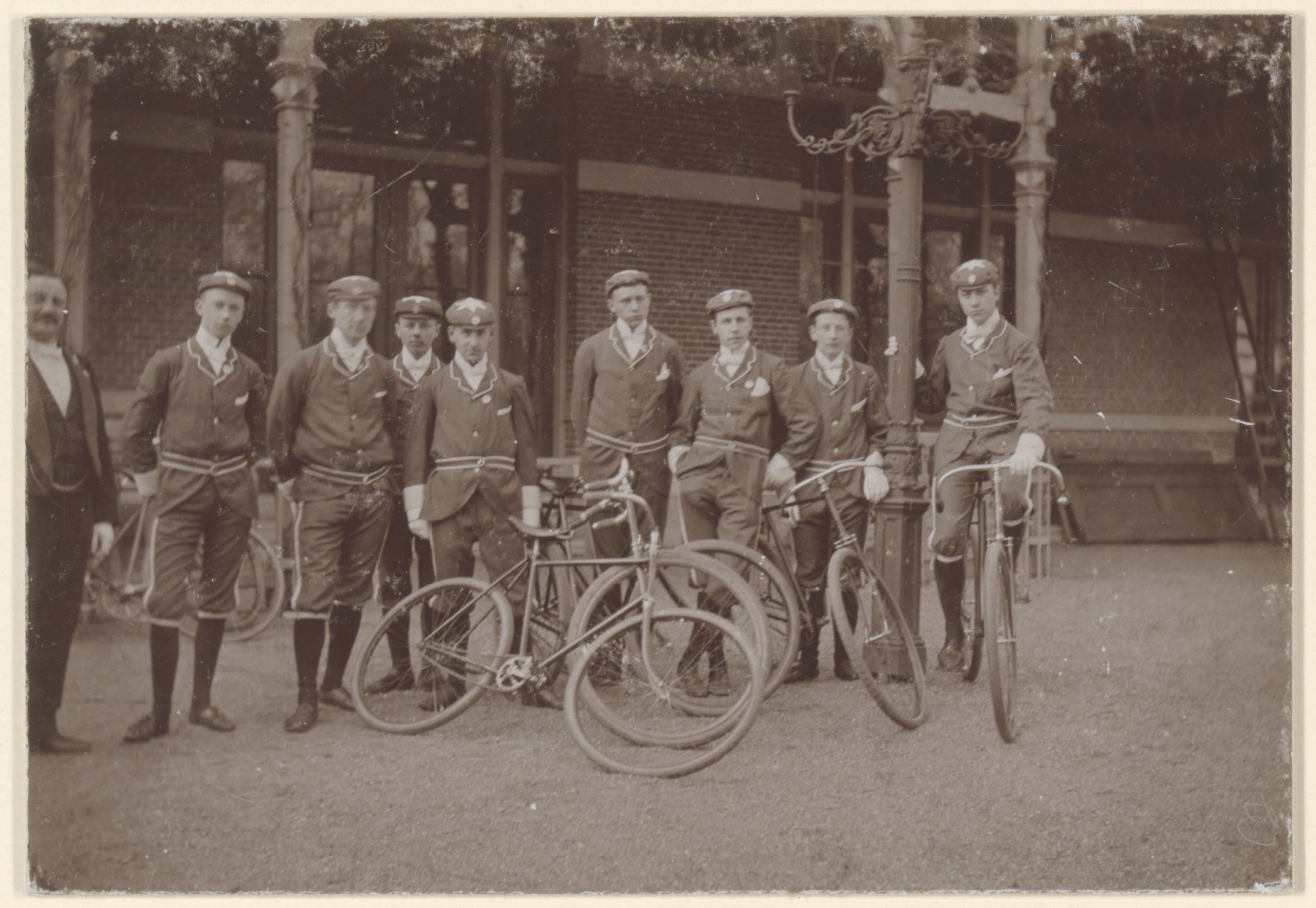 Groep mannen met hun fiets in de tuin van schouwburg Kunstmin.