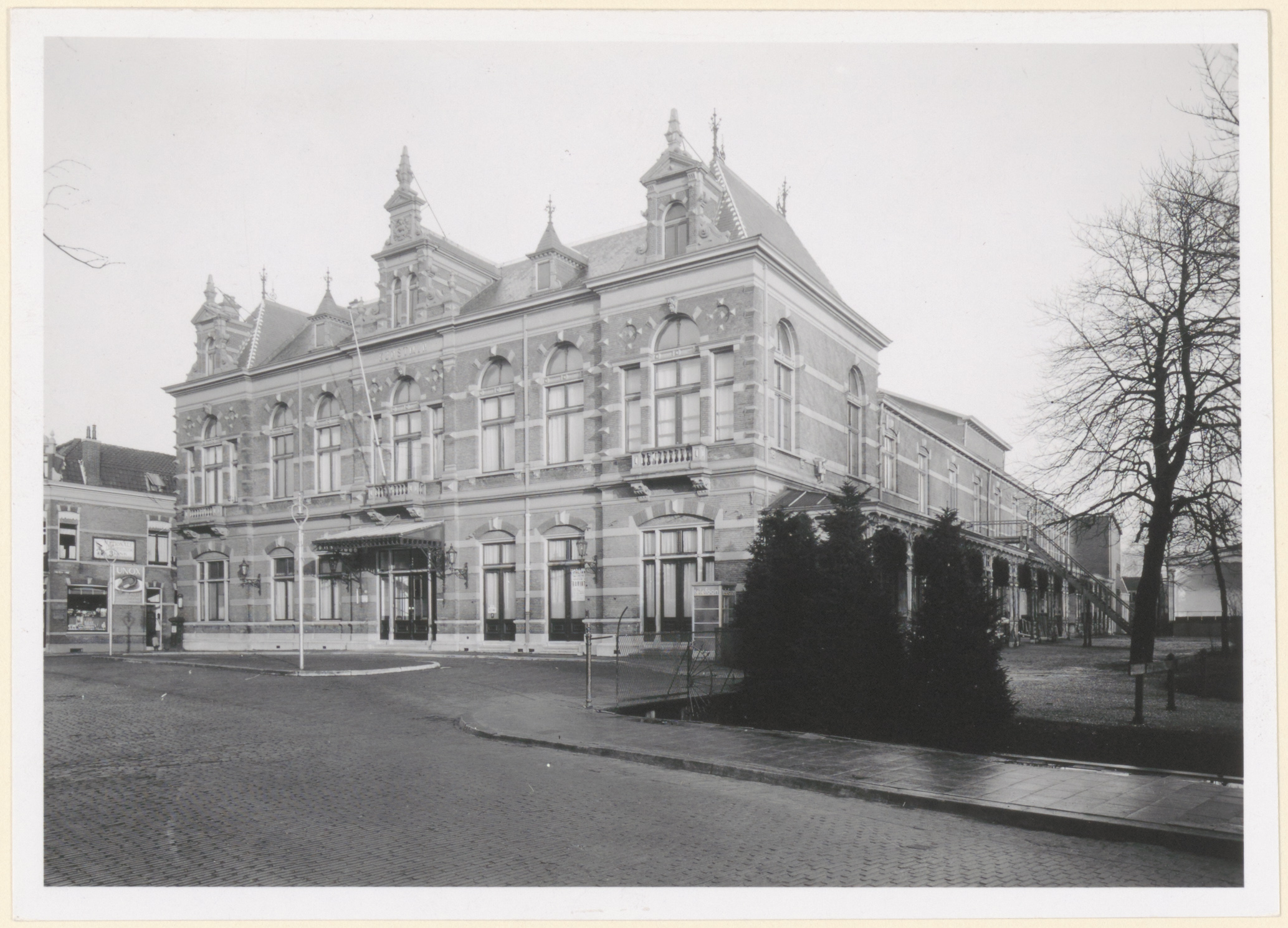 Schouwburg Kunstmin aan de Sin Jorisweg. Links het Matena's Pad met de kruidenierswinkel van A. Bijl op de hoek. De noodtrap kwam in de tuin uit, die omgeven was door een hek en een sloot.