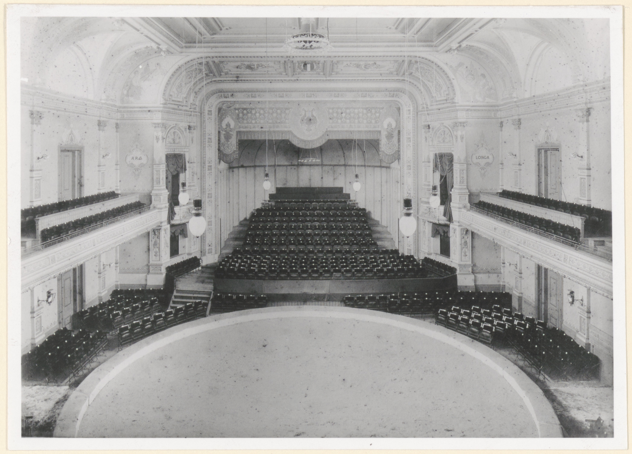 - De grote zaal van schouwburg Kunstmin, ingericht voor een circusvoorstelling. Stoelen voor het publiek stonden op het toneel.