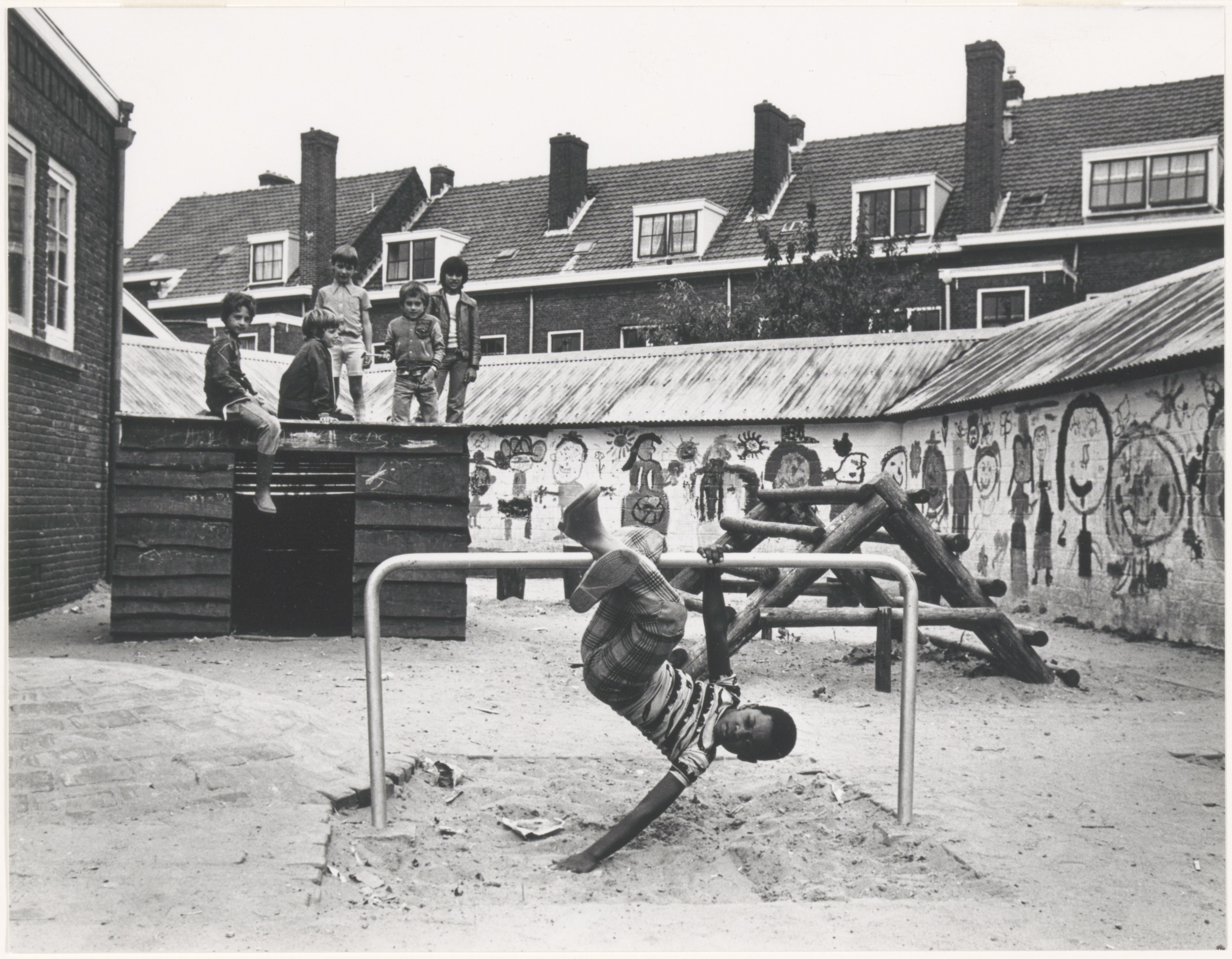 Speelterreintje naast het badhuis (links) in de Goeverneurstraat. De huizen staan in de …