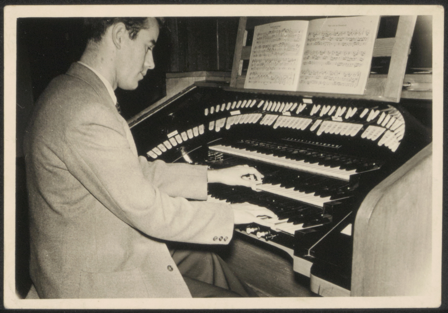 - Componist en dirigent Otto Deden aan het klavier van het orgel in de Antoniuskerk aan de Burgemeester de Raadtsingel.