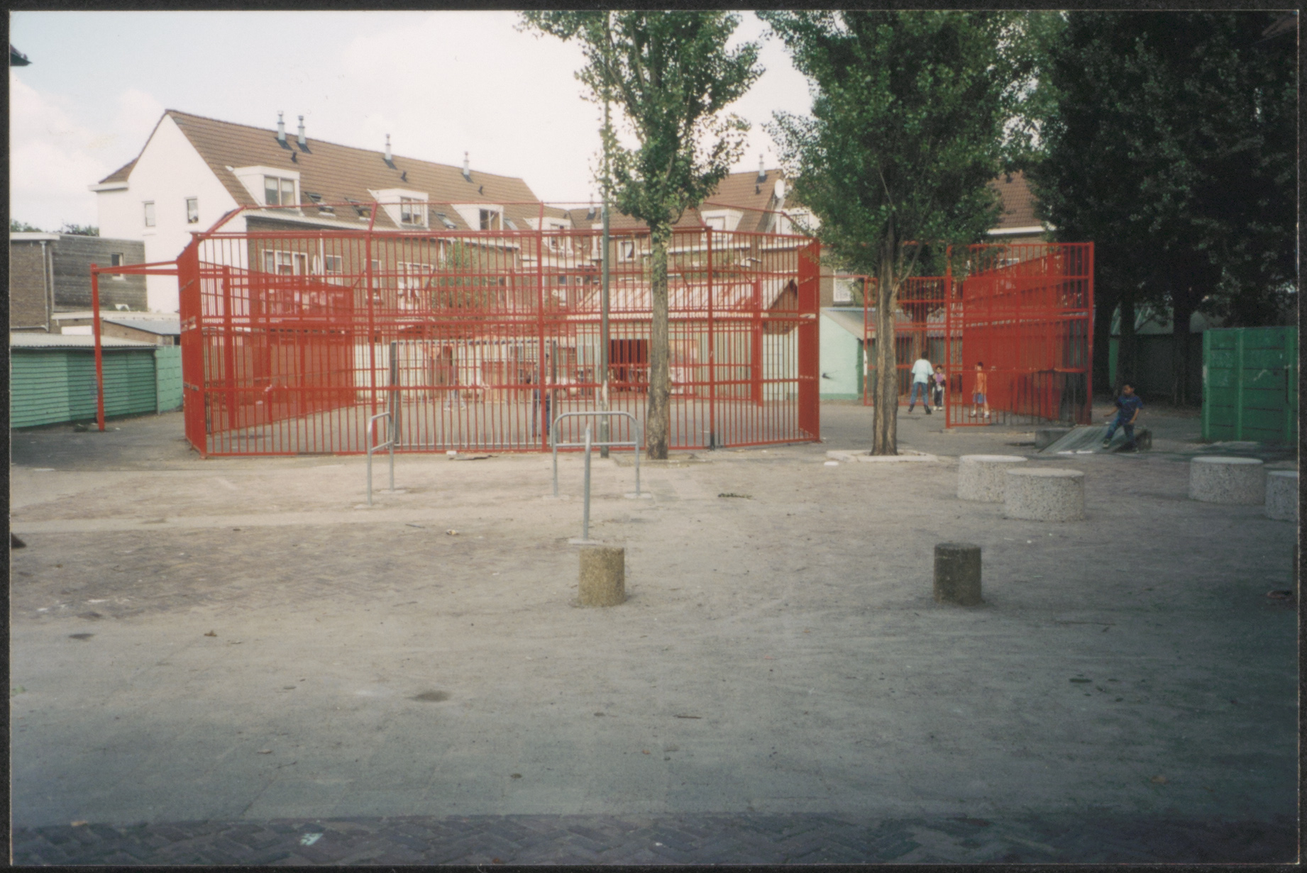 - Door hekwerk omgeven speelterrein in het gebied van het gesloopte badhuis in de Goeverneurstraat.
