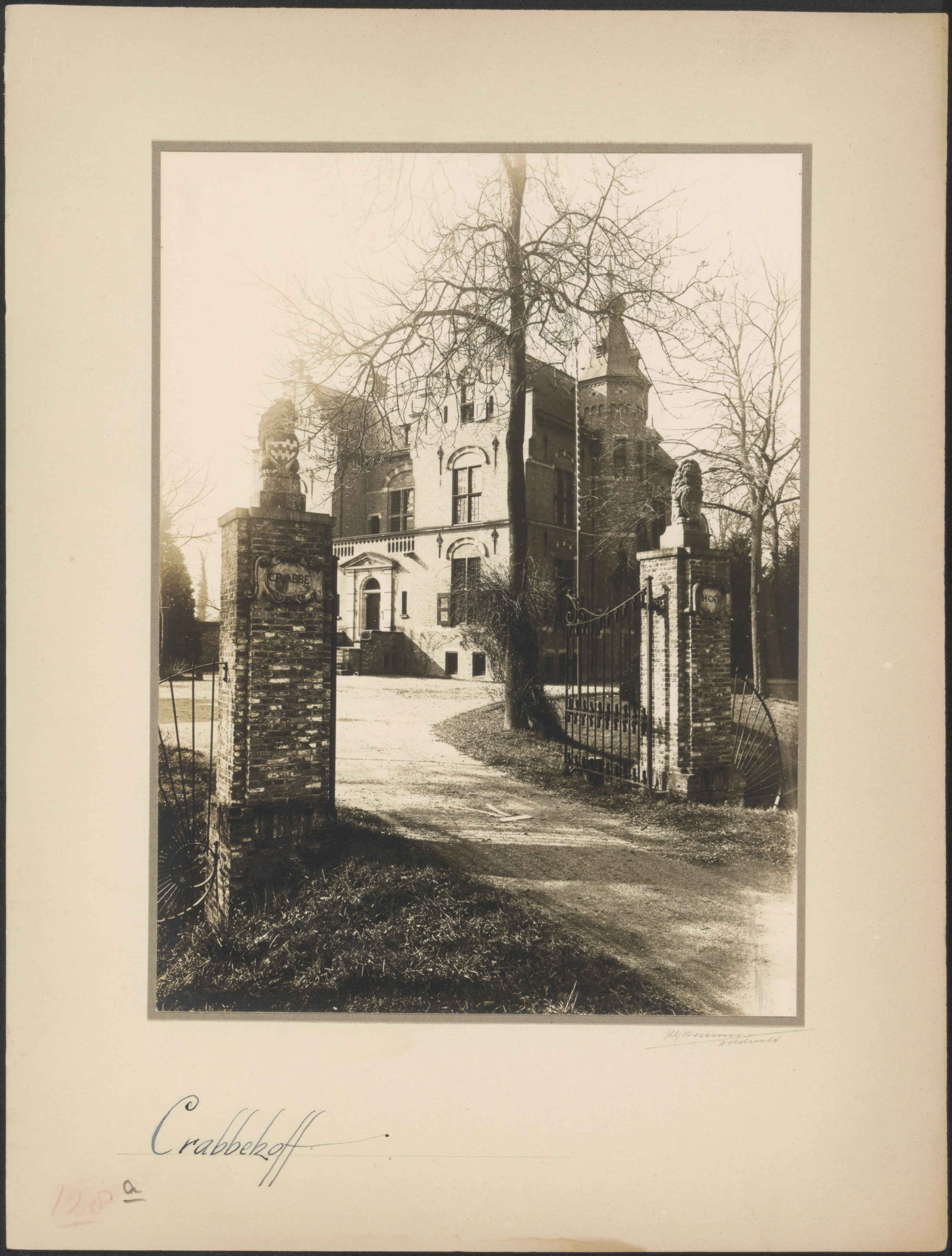 - De met wapens gekroonde en van cartouches met de naam voorziene pilaren van het toegangshek van kasteel Crabbehoff aan de Talmaweg.